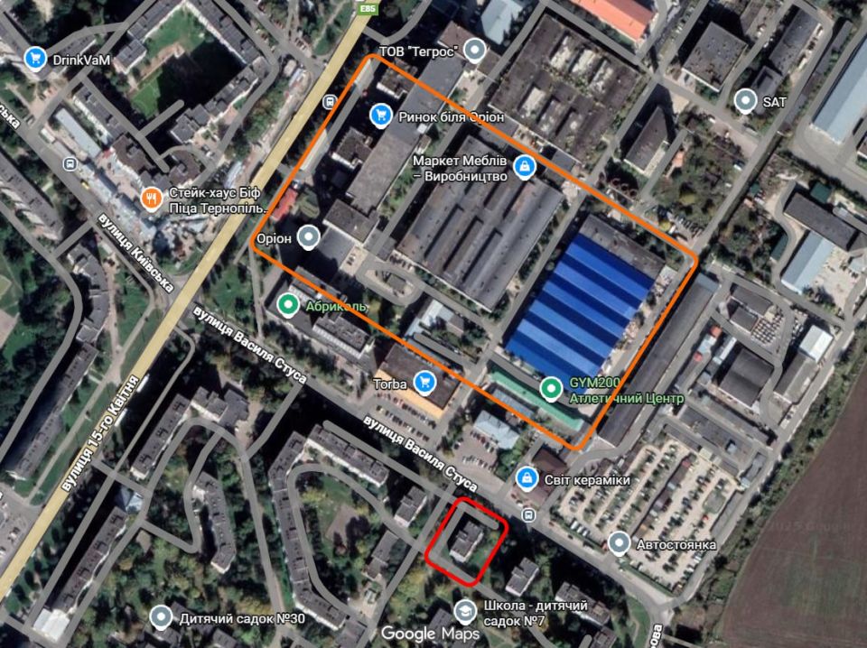 На карте примерная территория завода обведена оранжевым. Красным помечен жилой дом, в который по вине украинской ПВО был прилёт. К сожалению погибло 26 жителей.