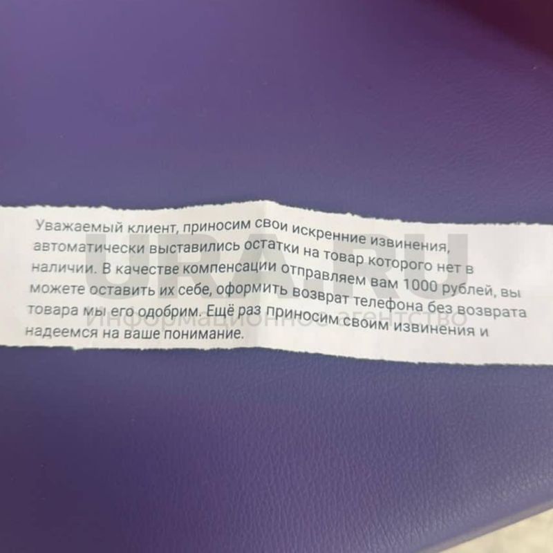 В записке было пояснение: остатки товара в каталоге оказались автоматически, в наличии его не было, поэтому заказ был оформлен. Продавец предложил сделать возврат без самого устройства, а деньги оставить себе. Сумму за смартфон вернуть удалось, но после многочисленных обращений, заметила женщина.