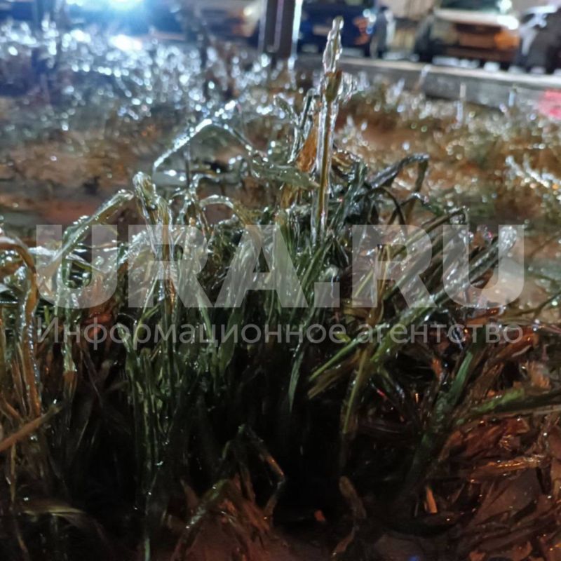 Тюмень попала в «ледяной плен». Вчера в городе прошел дождь — лед покрыл перила, растения и дороги, создав опасные условия для передвижения.