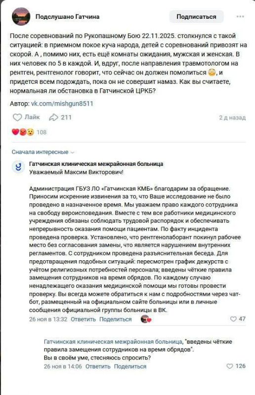 В Гатчинской межрайонной больнице разгорелся скандал: рентгенолог отказался принимать пациентов, заявив, что ему «пора на намаз». Людей просто попросили подождать, что вызвало шквал возмущения в сети.