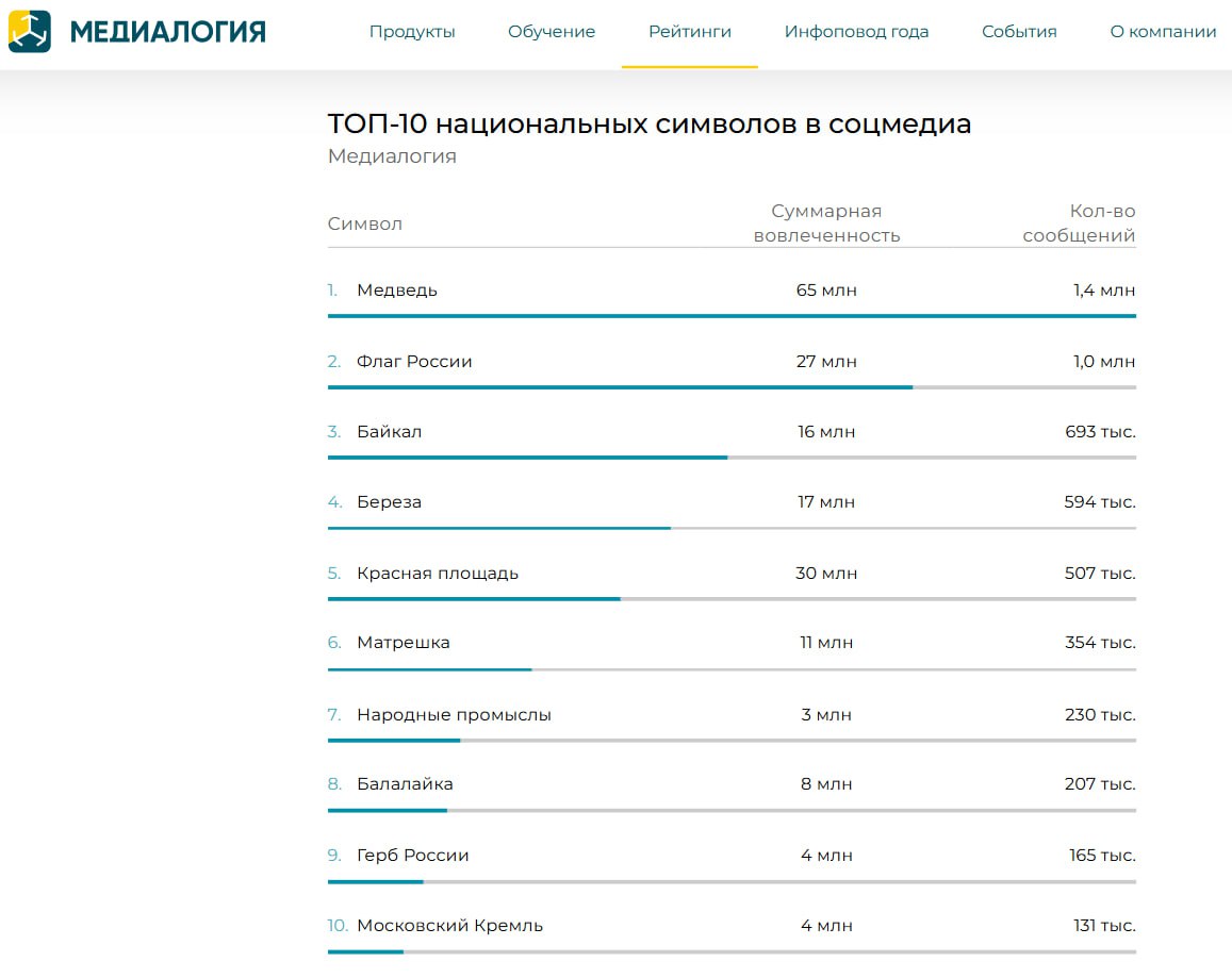 В 2025 году в русскоязычном сегменте соцсетей лидером обсуждений национальных символов стал медведь: число упоминаний осталось на уровне 2024 года, но вовлеченность выросла на 34% — с 48 млн до 65 млн.