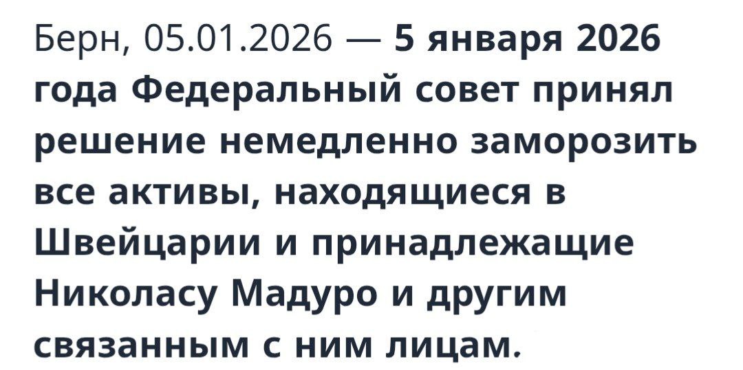 Швейцария вновь прогнулась. Ее банки заморозили все активы президента Венесуэлы Мадуро после его ареста и убийства 80 венесуэльцев во время вторжения.
