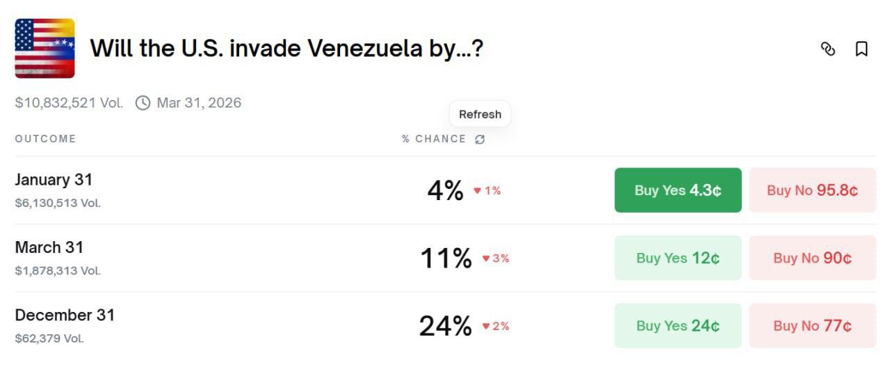 Шанс на вторжение США в Венесуэлу до конца месяца на Polymarket до сих пор оценивают в 4%.
