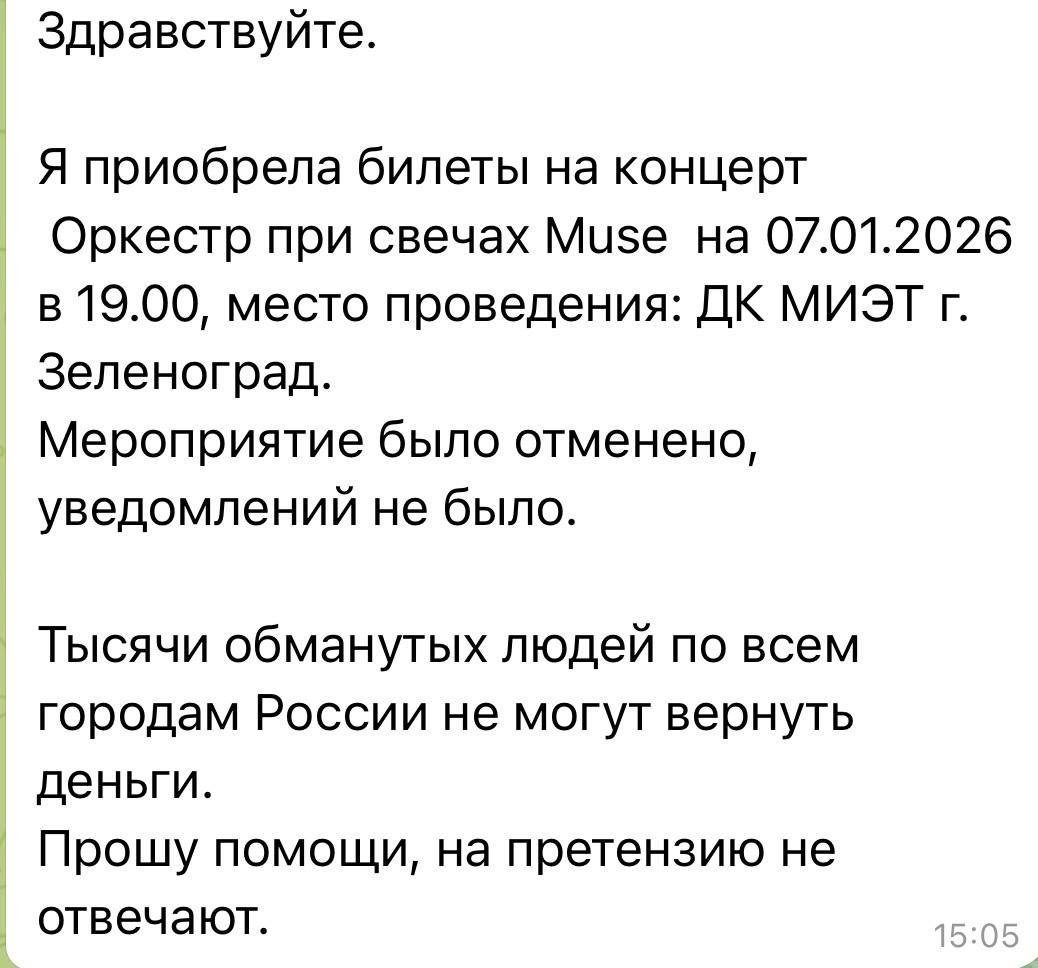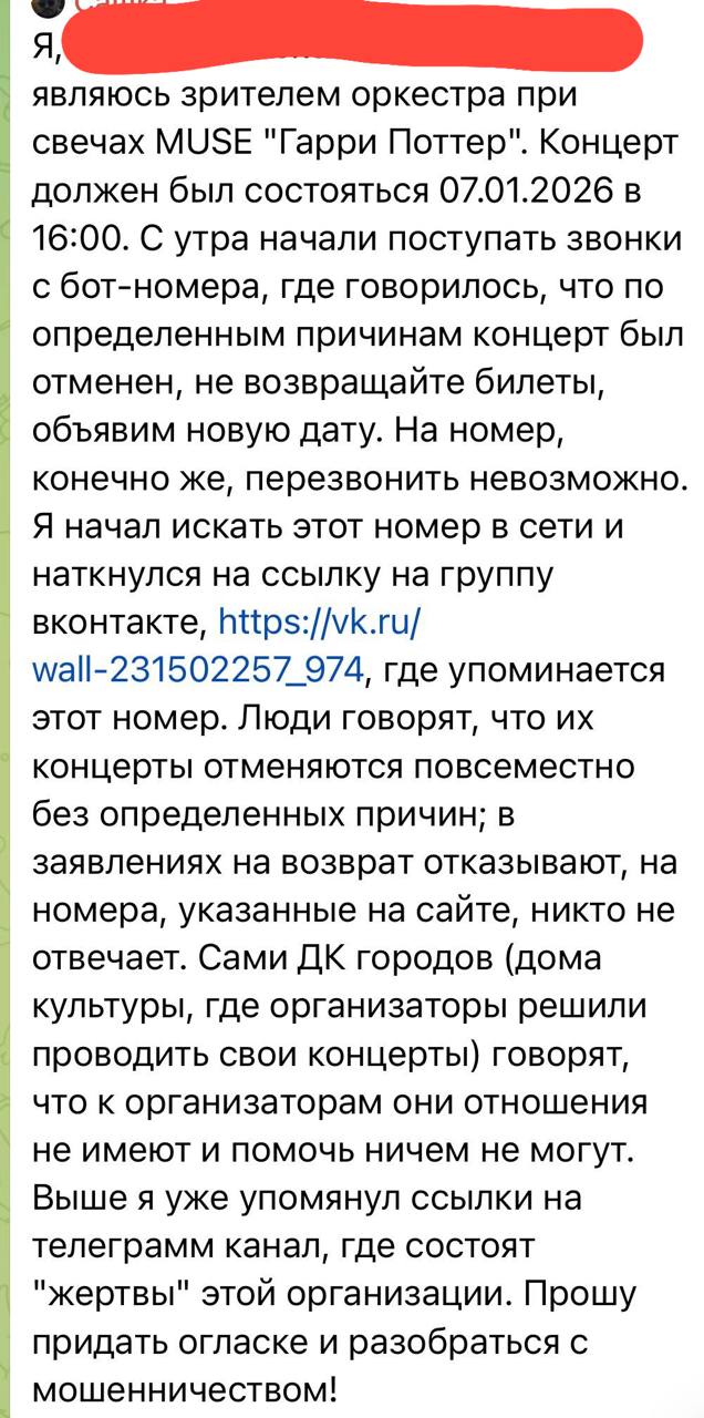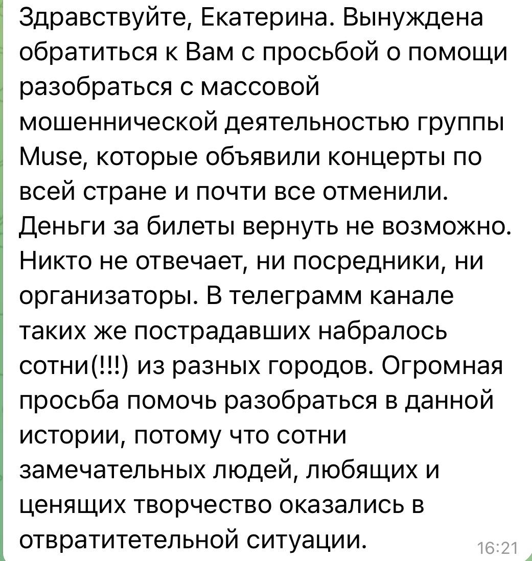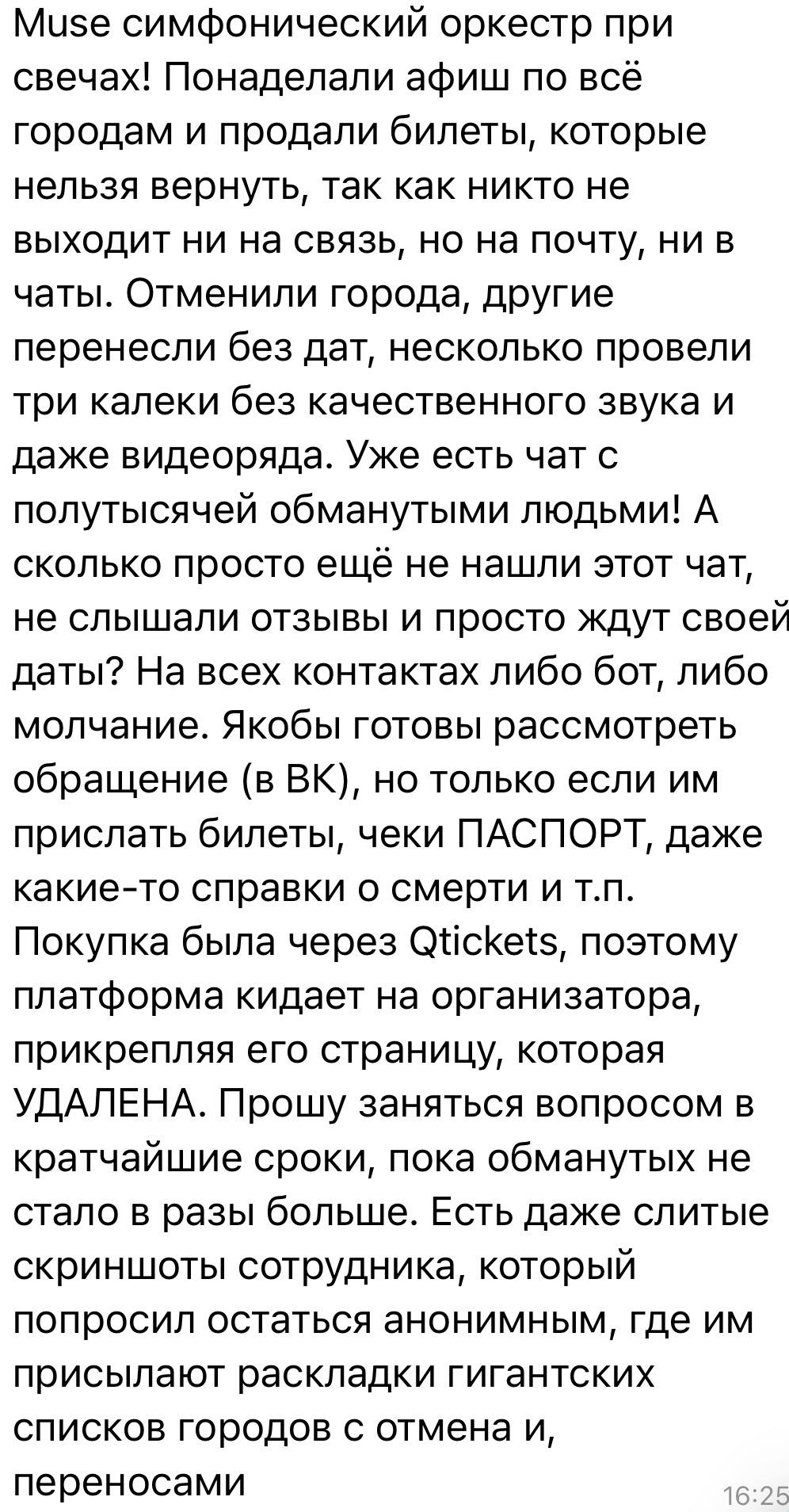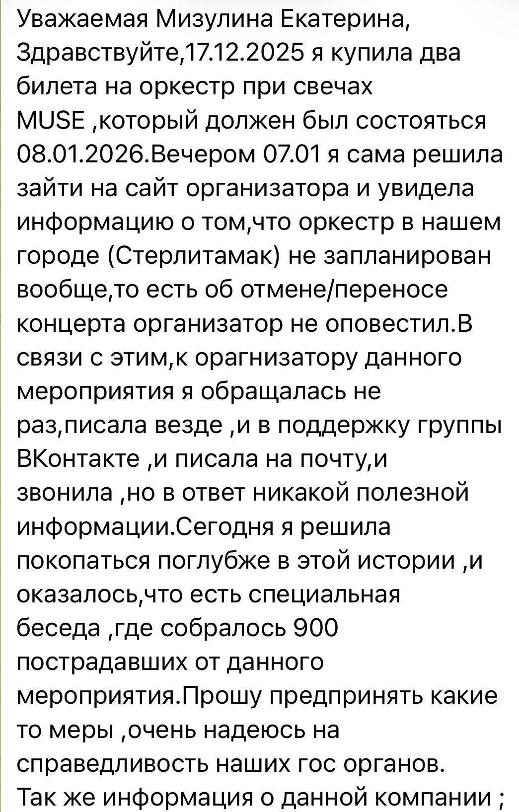 Уже несколько дней мне пишут люди, которые приобрели билеты на «Оркестр при свечах Muse»: никаких концертов не проводилось, все мероприятия отменены, а средства им не возвращают. Очень похоже, что это массовая схема мошенничества - пострадавших (по данным СМИ) может быть более 50 тысяч человек в разных городах. Концерты активно рекламировали как в соцсетях, так и с помощью афиш в городах. Теперь никто не может получить обратной связи от организаторов и свои деньги, вместо этого просят прислать паспортные данные и номер карты (что само по себе подозрительно).