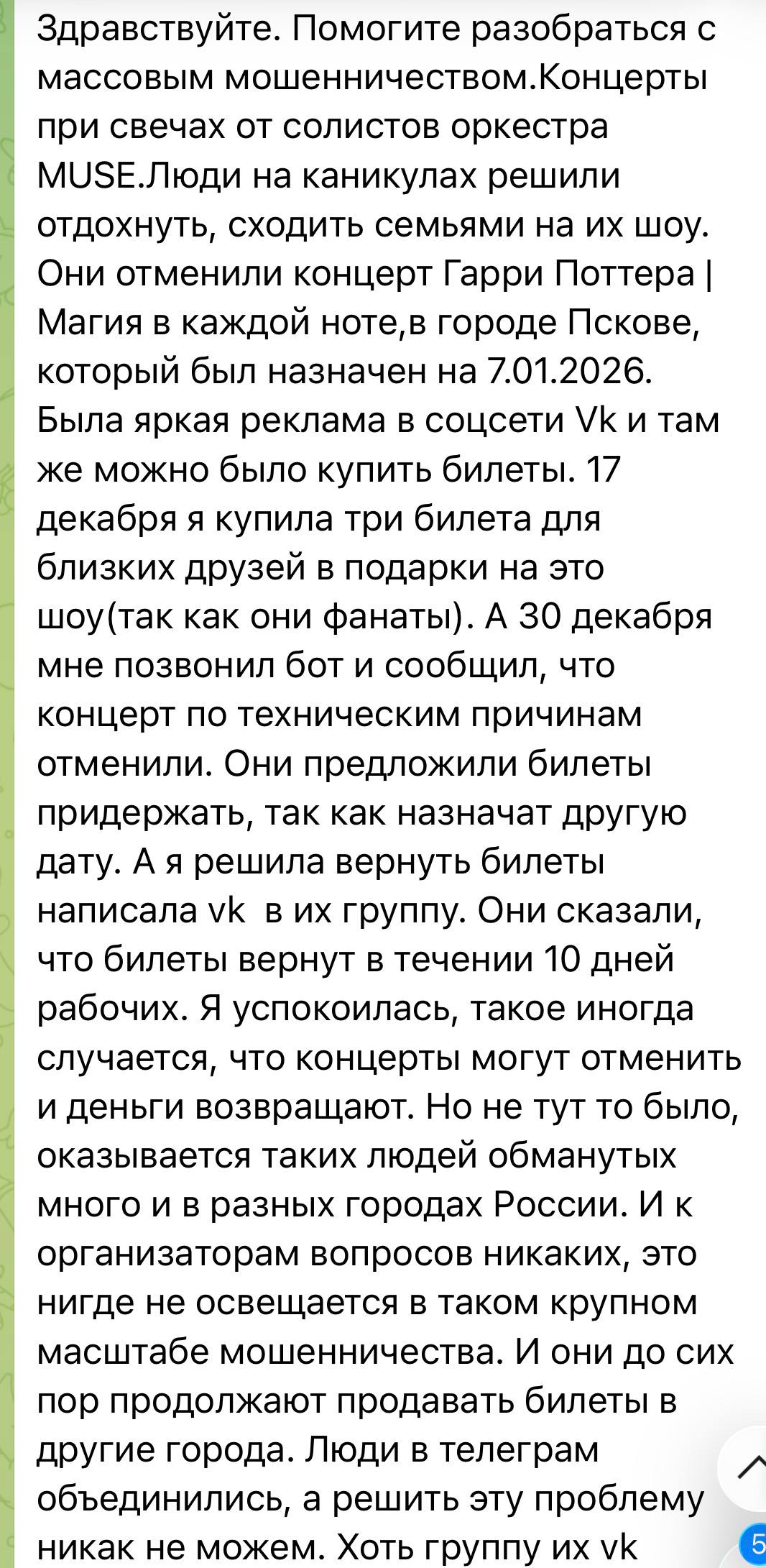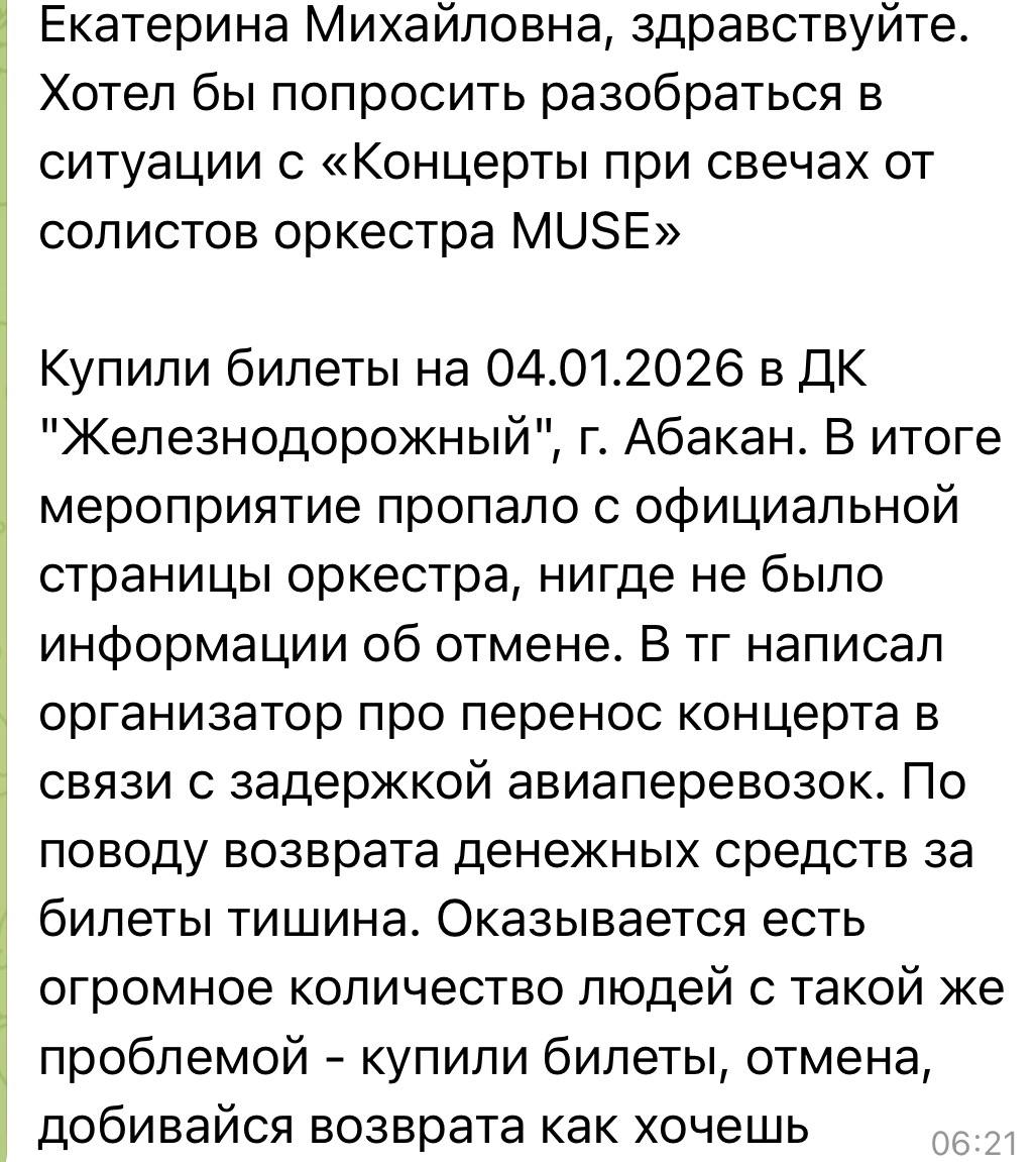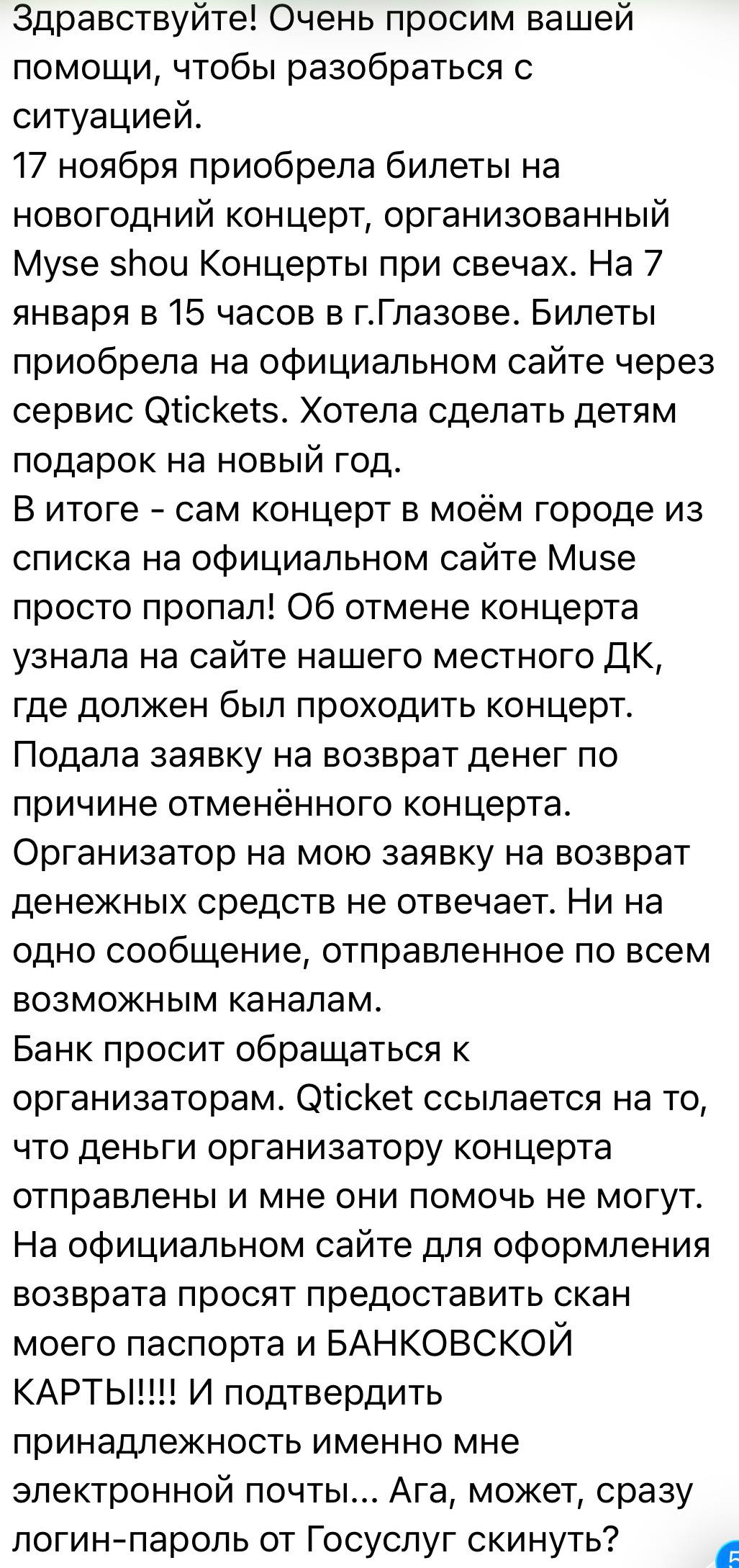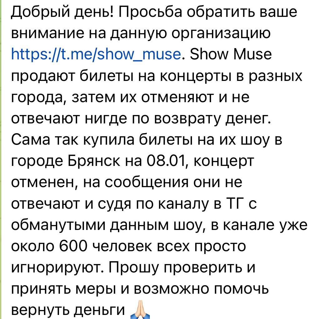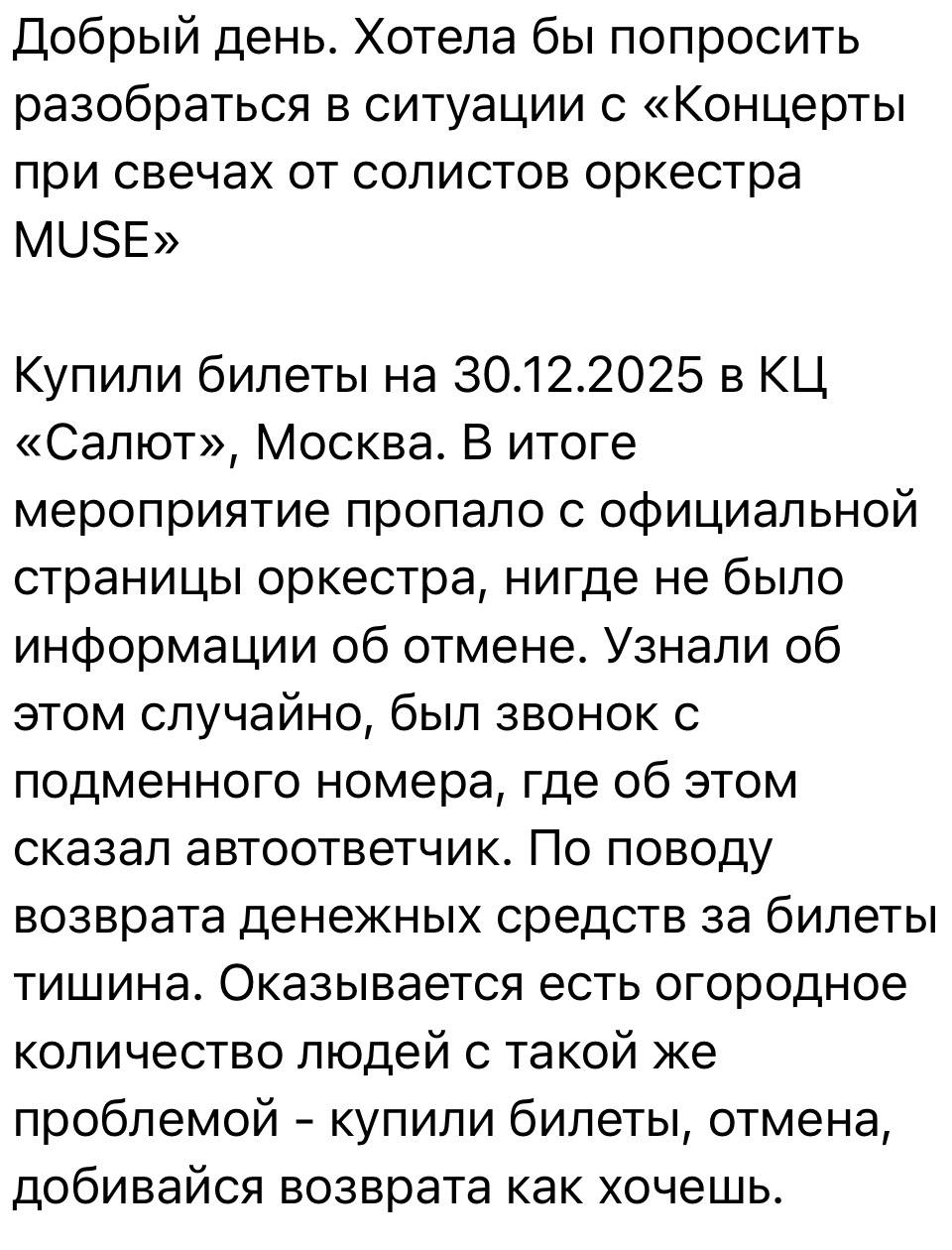 Уже несколько дней мне пишут люди, которые приобрели билеты на «Оркестр при свечах Muse»: никаких концертов не проводилось, все мероприятия отменены, а средства им не возвращают. Очень похоже, что это массовая схема мошенничества - пострадавших (по данным СМИ) может быть более 50 тысяч человек в разных городах. Концерты активно рекламировали как в соцсетях, так и с помощью афиш в городах. Теперь никто не может получить обратной связи от организаторов и свои деньги, вместо этого просят прислать паспортные данные и номер карты (что само по себе подозрительно).