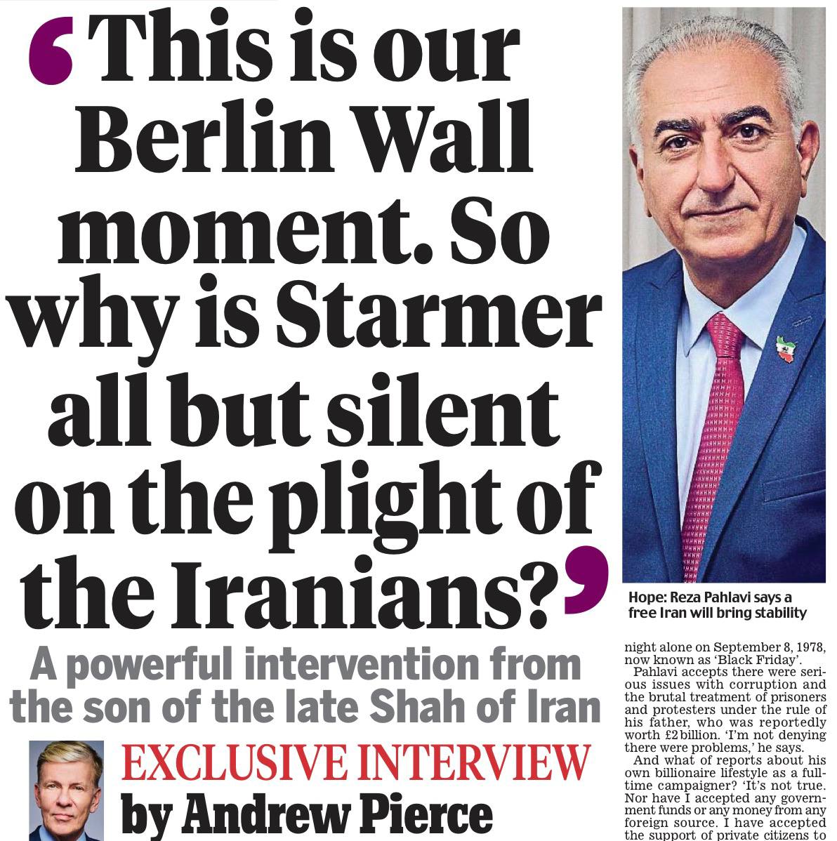 Сегодняшняя Daily Mail публикует интервью с Реза Пехлеви, наследником некогда бежавшего иранского шаха. Куча пафоса о «борьбе за демократию и свободу».