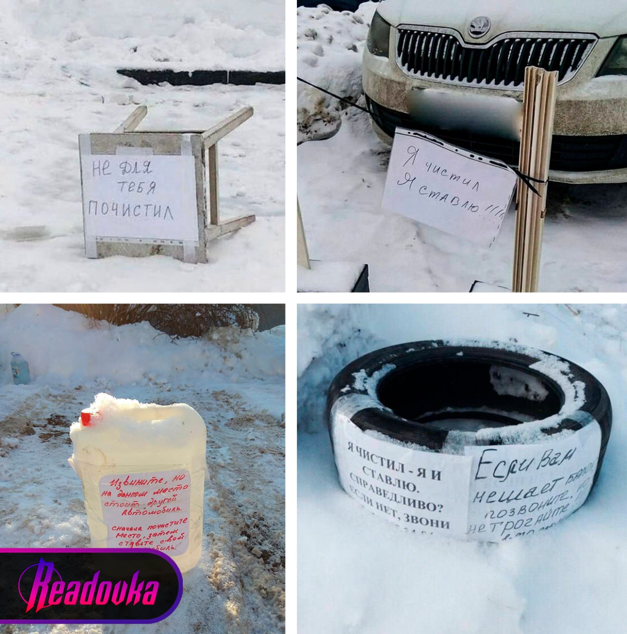 В Москве нашли способ борьбы с соседями, которые паркуют машины на уже расчищенных кем-то местах. Автомобилисты оставляют угрожающие записки, «забивают» места шинами и пустыми канистрами. Факт того, что места общие, их не волнует.
