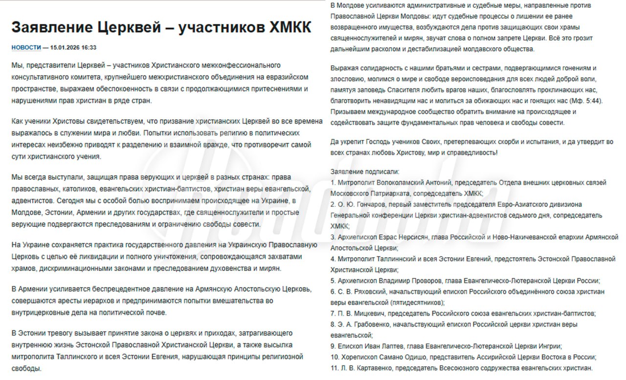 Христианский межконфессиональный консультативный комитет (ХМКК) опубликовал заявление, в котором осуждает использование религии в политических целях. Представители разных конфессий подписали общий документ, кроме главы католиков России, архиепископа Павла Пецци. Гонения христиан происходят в Молдавии, Эстонии, Армении, на Украине и других странах, а позиция Пецци вызвала ряд вопросов, так как представители католицизма не раз высказывались о схожих ситуациях в различных регионах мира, отметили в РПЦ РИА Новости.