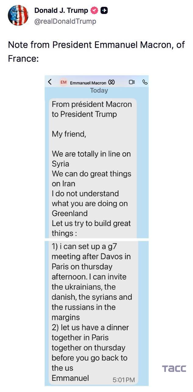 Трамп опубликовал в Truth Social сообщение от Макрона, который предложил провести встречу G7 с участием России: