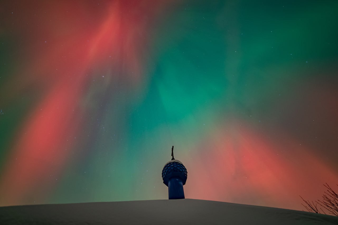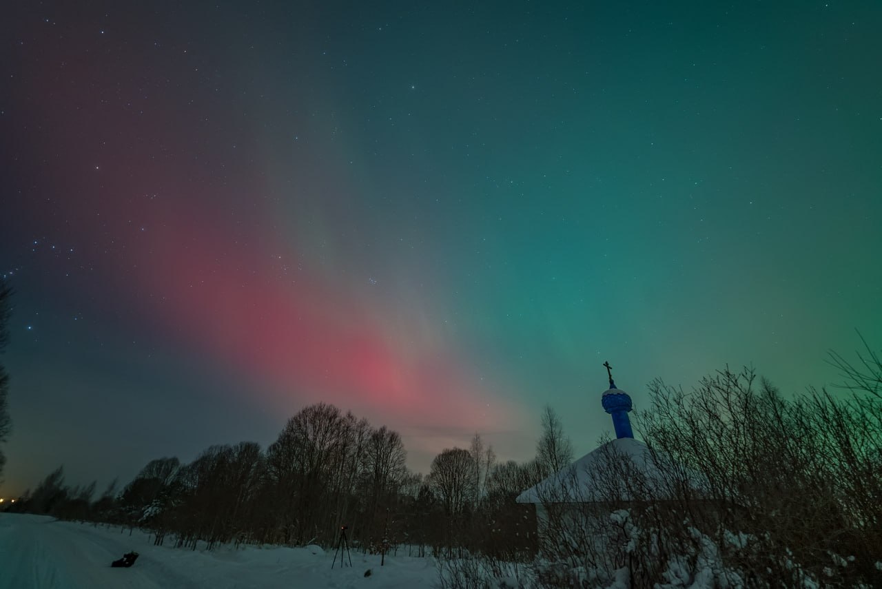 Красно-зелёное северное сияние полыхало в небе над Псковской областью.