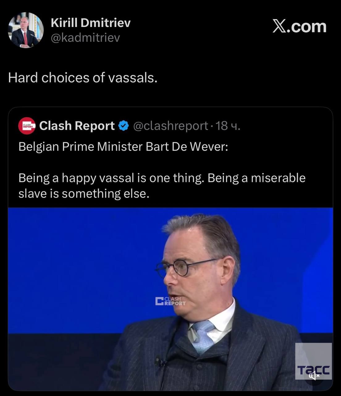 Дмитриев назвал сложным выбором размышления премьера Бельгии о вассале и рабе.