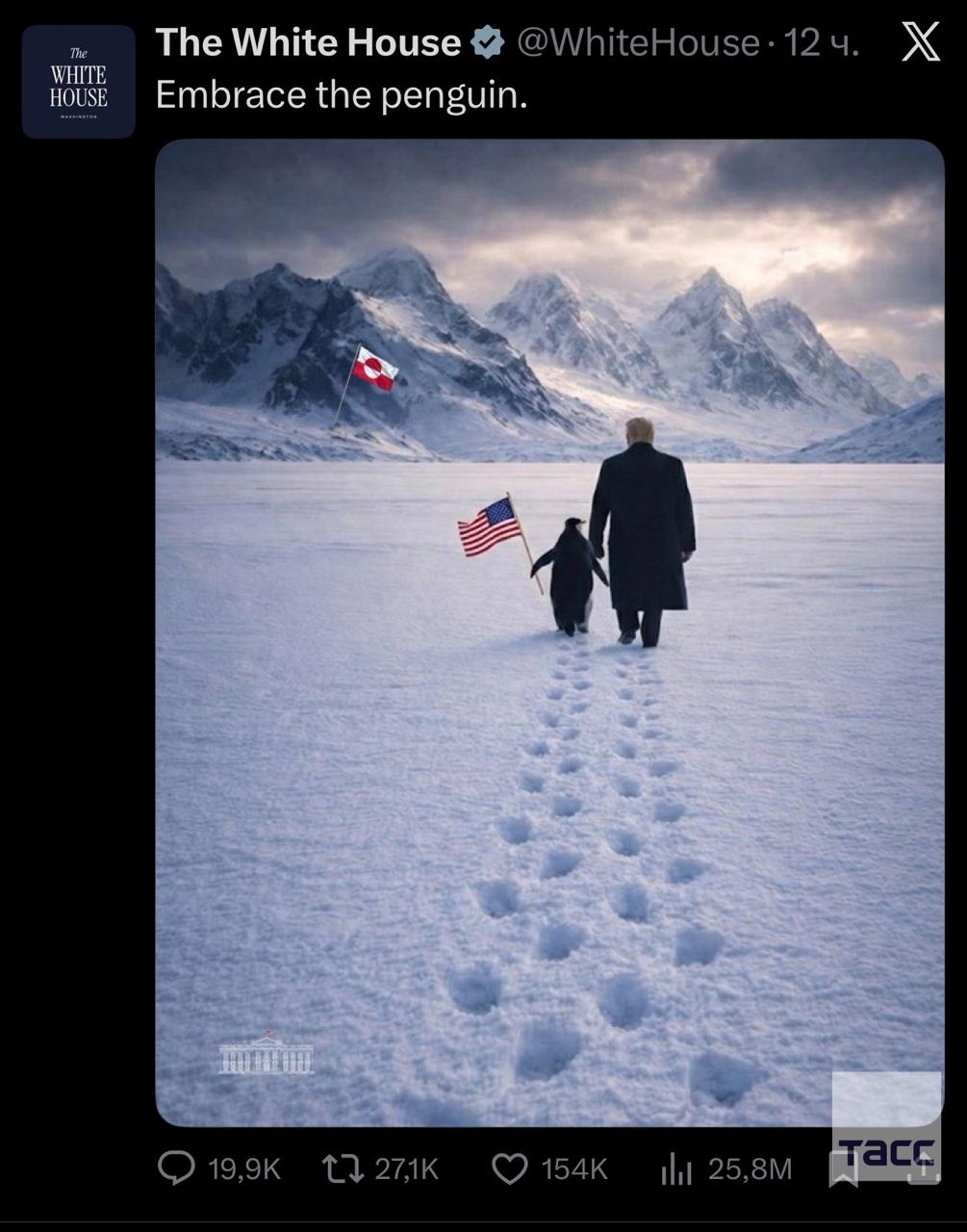 Белый дом опубликовал сгенерированное изображение с Трампом, идущим по Гренландии с пингвином, который несет флаг США.