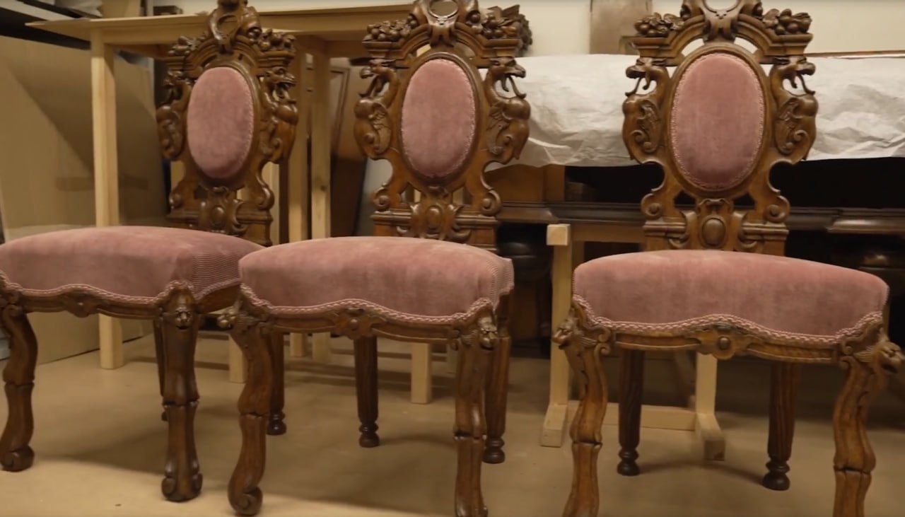 Об этом сообщили в музее. Стулья пострадали во время пожара в 2022 году. Их реставрацией занимались специалисты в Санкт-Петербурге. Стулья, украшенные резьбой с мотивами виноградных лоз и грифонов, были покрыты сажей, имели трещины, утраты древесины и резных элементов. Во время реставрации проведены дезинсекция, очистка, восполнение утрат и обновление обивки. Под старой обивкой был обнаружен фрагмент оригинальной ткани, по образцу которой подобрали новую. Стулья были приобретены Псковским музеем в 1990-х годах.