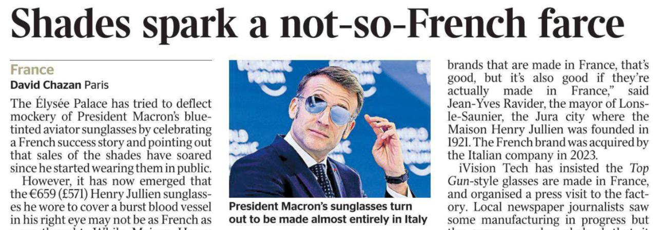 Британцы радостно сообщают, что черные очки, в которых красовался Макрон, сделаны не во Франции, а в Италии. Во всяком случае, The Times сегодня этому отдельную статью посвятила.