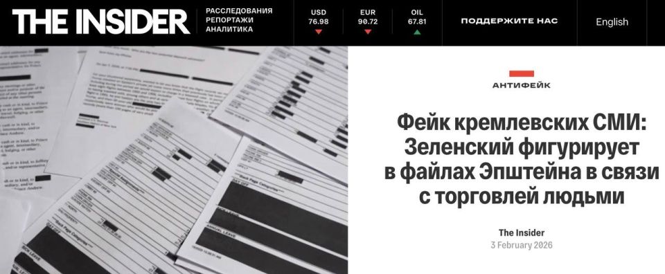 Инфопомойка сбежавших иноагентов The Insider* - это что-то с чем-то! Она гневно разоблачает «фейк кремлевских СМИ», которые, видите ли, нашли упоминания Зеленского в файлах Эпштейна в связи с обвинениями в причастности к торговле людьми.