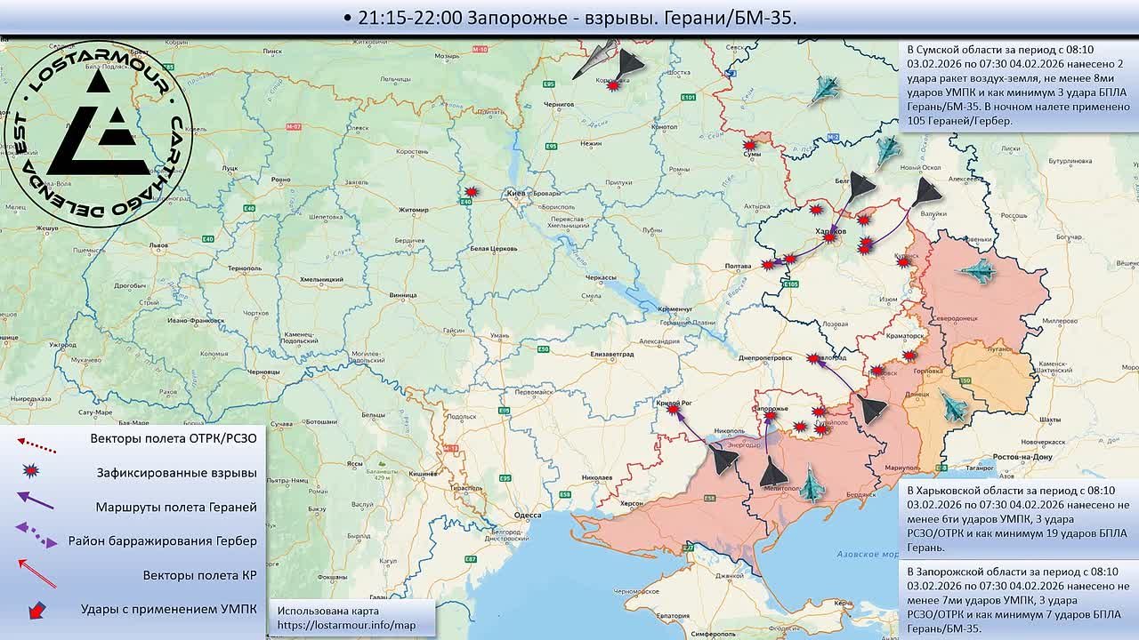 Анимированная схема ударов по территории Украины 03 февраля 2026 – 04 февраля 2026 года.