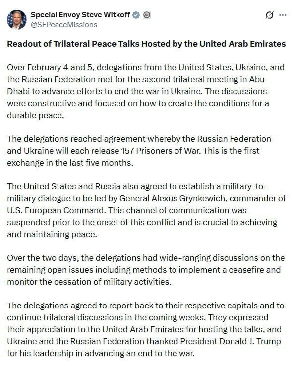 Трехсторонние встречи в Абу-Даби носили конструктивный характер и были сосредоточены на создании условий для прочного мира, заявил Уиткофф. В ходе переговоров делегации США, РФ и Украины обсудили обеспечение прекращения огня и механизм мониторинга.