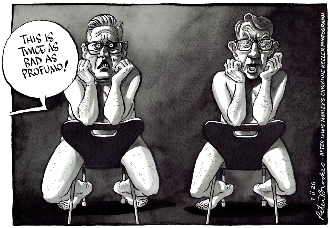 Первый раз вижу, чтобы карикатуристы The Times плагиатили темы из других английских газет. Но вот вчера The Indepdent посадила Кира Стармера в позу модели Кристин Килер, потопившей всесильного британского министра Джона Профьюмо в 60-е годы. А сегодня The Times использовала эту картинку и «подсадила» рядом некогда всесильного Питера Мендельсона со словами: «Это в два раза хуже Порфьюмо».