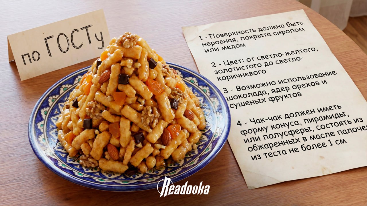 ГОСТ на чак-чак сформулировали и утвердили в России. В документе Росстандарта описаны единые требования к составу и процессу изготовления блюда — начиная с пропорций ингредиентов и заканчивая уровнем влажности чак-чака. В новом ГОСТе сказано, что у продукта должны быть выраженные медовые вкус и запах.
