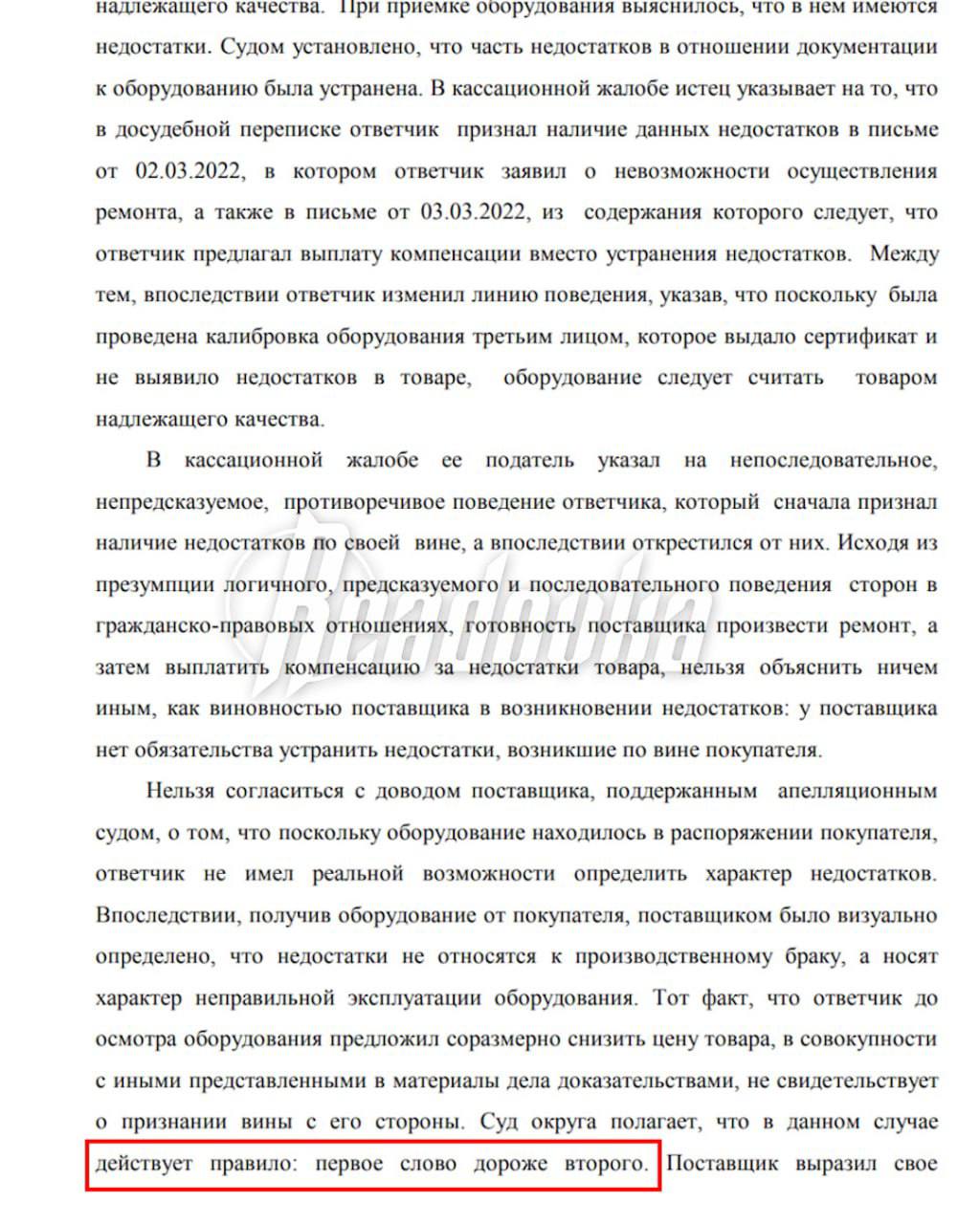 В июле 2025 года Арбитражный суд Московского округа рассматривал спор по договору поставки: исполнитель поставил заказчику бракованное оборудование. Заявитель (он же заказчик) привел довод, что ответчик (он же исполнитель) сначала признал наличие брака, а затем заявил, что все с техникой в порядке. В суде, впрочем, ответили следующим образом: