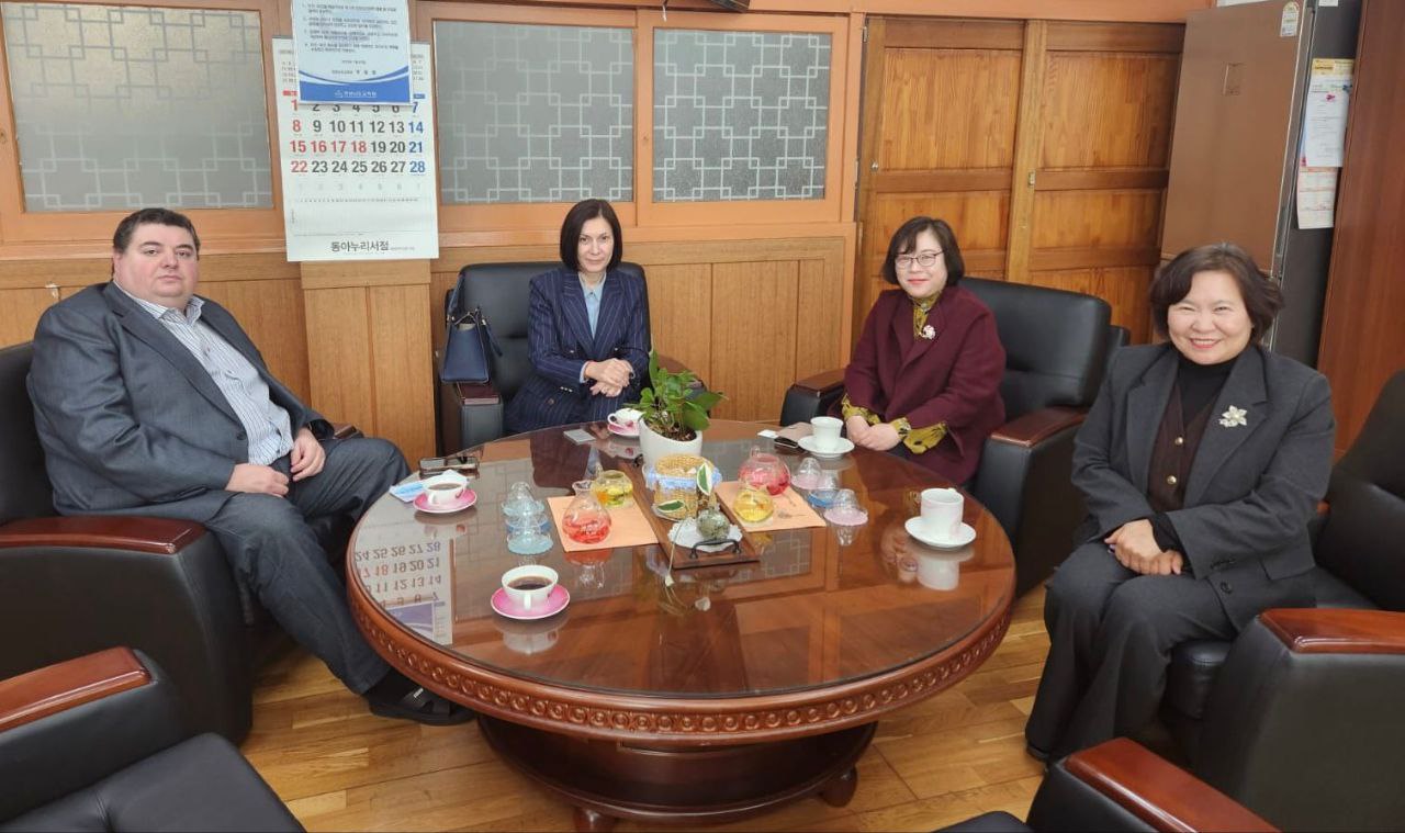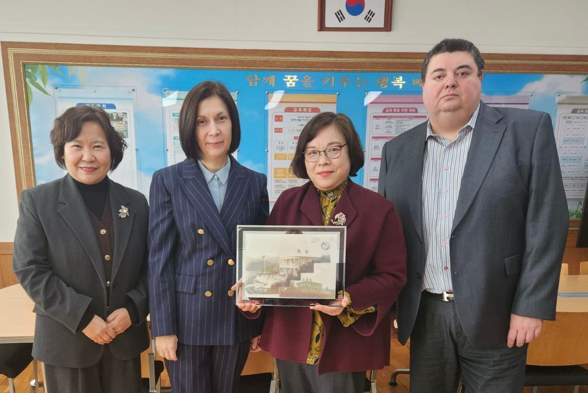 Генеральный консул Оксана Дудник рассказала директору школы Квон Хэ Чжон об истории праздника и традициях российской дипломатии, а также о первых российских консульских учреждениях на юге Кореи. Генконсул поблагодарила Квон Хэ Чжон за бережное отношение к исторической памяти и преподнесла в дар копию архивной фотографии с изображением здания Российского Императорского вице-консульства в Масанпо.