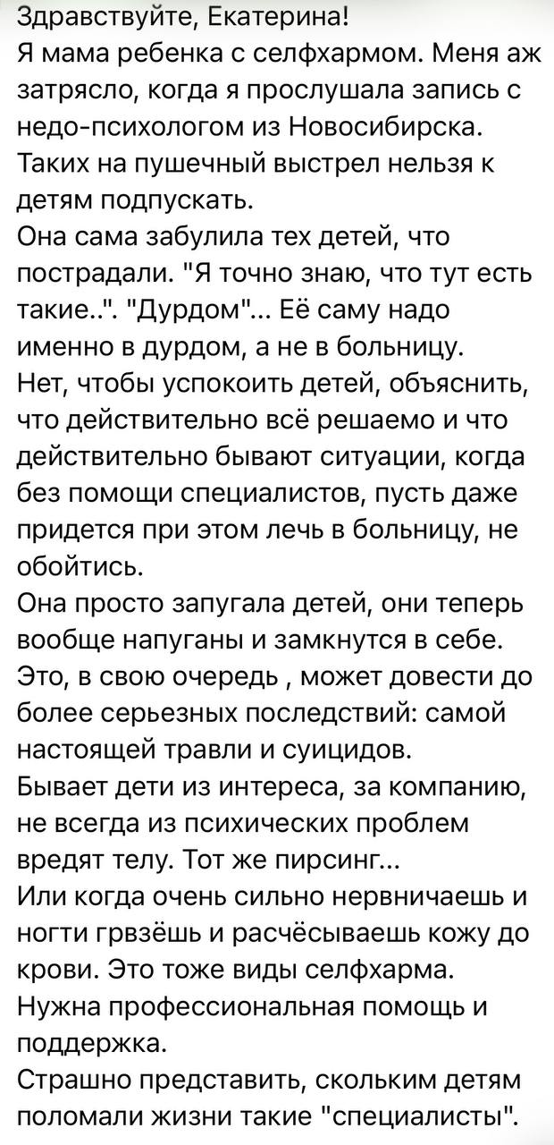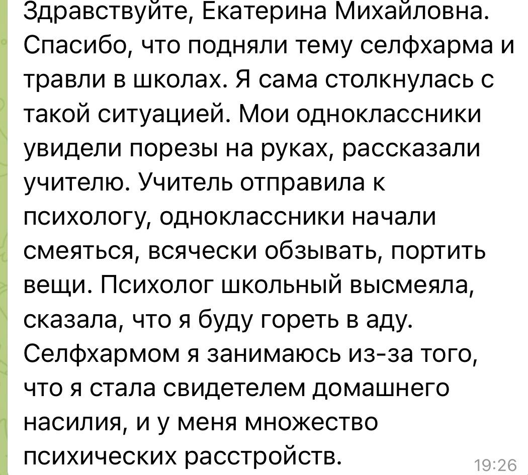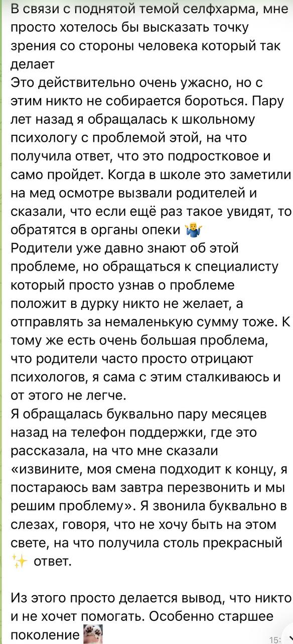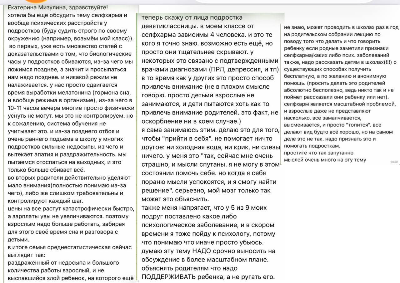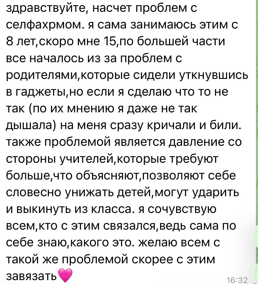 Очень много писем сейчас идет на тему селфхарма. Пишут как подростки, так и их родители. Большую часть их них не публикую по просьбе тех, кто со мной делится своими историями. Я публикую эти письма для того, чтобы ребята понимали, что они не одни с этим сталкиваются