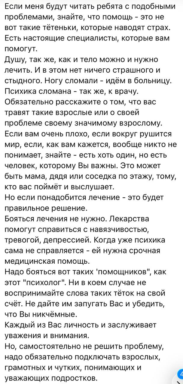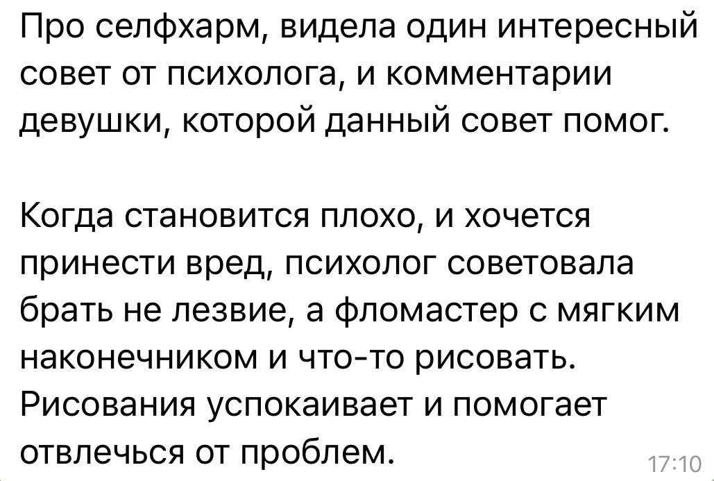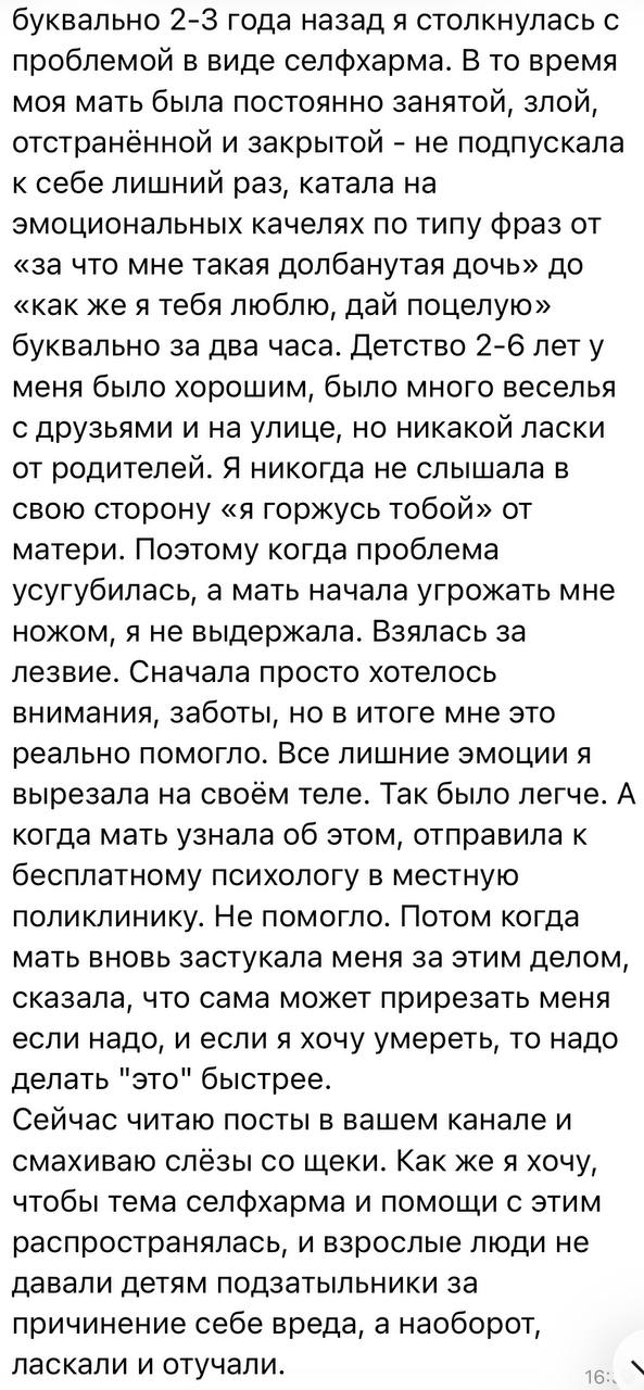 Очень много писем сейчас идет на тему селфхарма. Пишут как подростки, так и их родители. Большую часть их них не публикую по просьбе тех, кто со мной делится своими историями. Я публикую эти письма для того, чтобы ребята понимали, что они не...