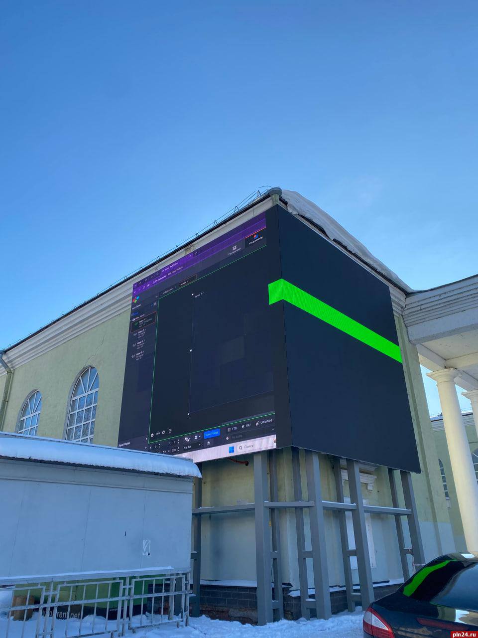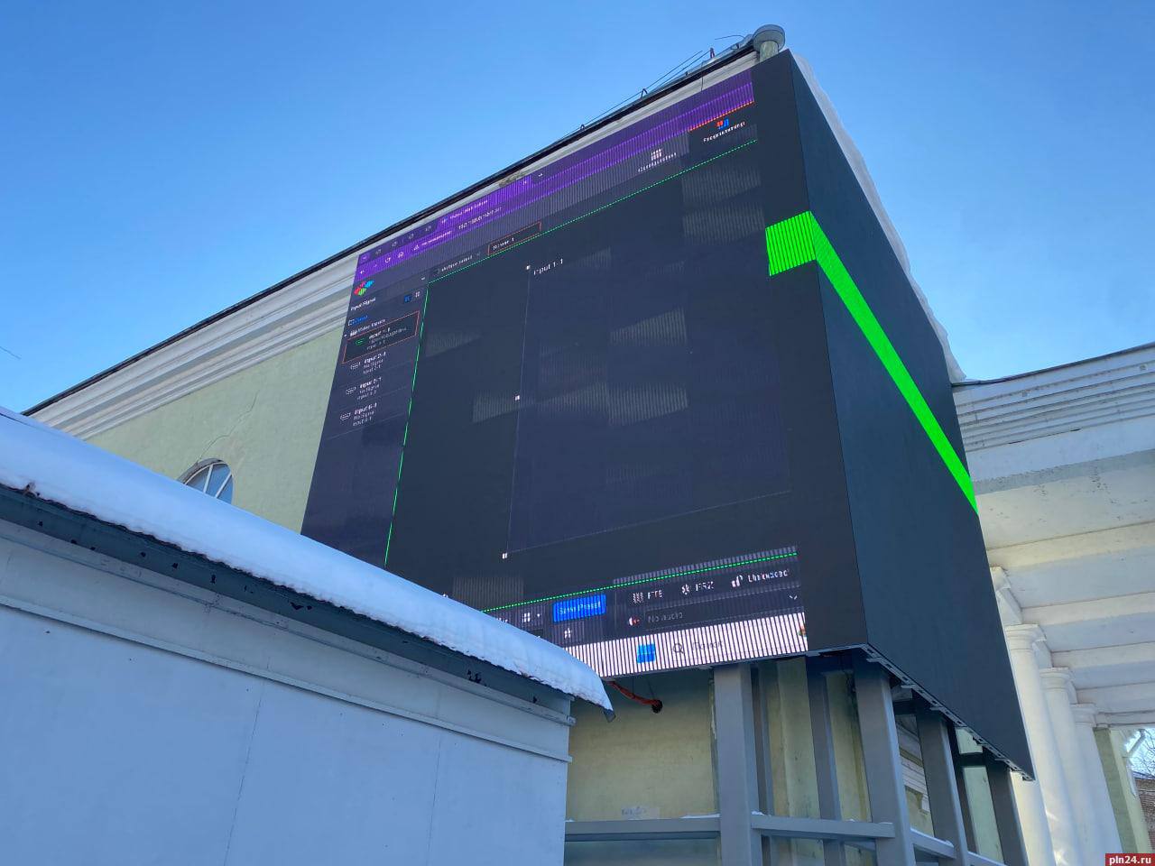 На фасаде Городского культурного центра в Пскове идут финальные работы по настройке крупного углового LED-экрана — уже видны первые тестовые изображения.
