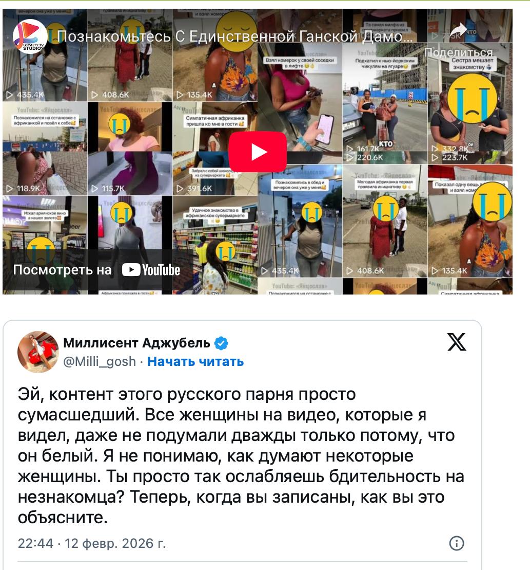 За дебильным псевдонимом предположительно скрывается блогер из Ульяновска Владислав Люльков – самопровозглашённый эксперт по пикапу. В соответствии с Законом Ганы о кибербезопасности ему грозит наказание в виде шести лет тюрьмы – три года за распространение интимного видео и три за расизм.