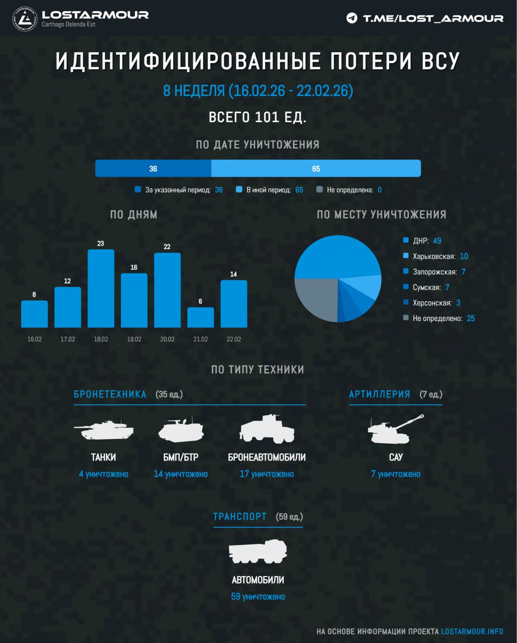 Идентифицированные потери ВСУ в технике в период с 16 февраля по 22 февраля 2026 года.