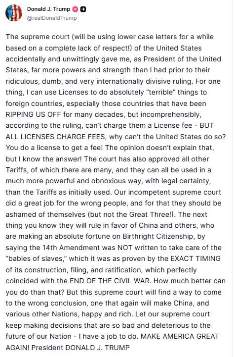 верховный суд (я какое-то время буду писать это название со строчных букв — из-за полного отсутствия уважения!) США случайно и невольно наделил меня, как президента США, куда большими полномочиями и возможностями, чем у меня было до их нелепого, глупого и крайне раскалывающего международное сообщество решения.