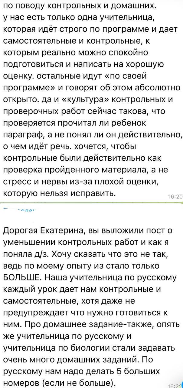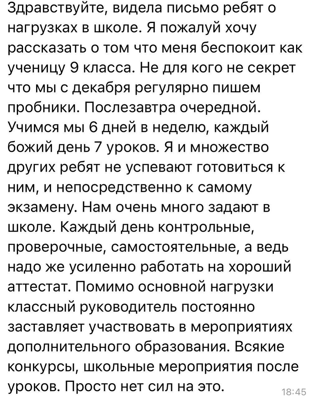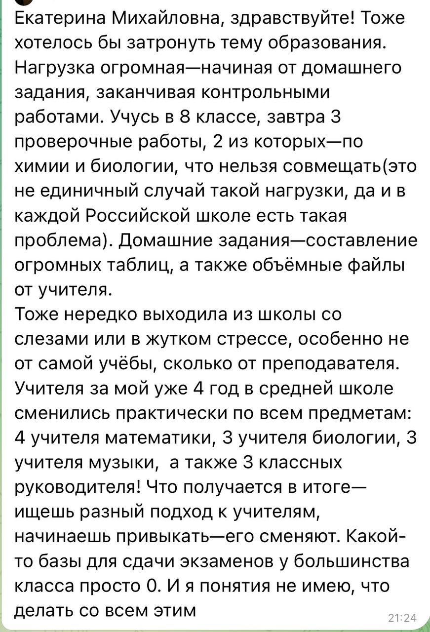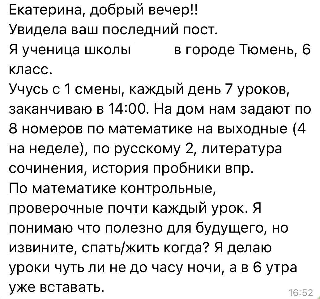 Вот, что пишут школьники. Письма на тему нагрузки в школах, количества контрольных и проверочных работ, домашнего задания я могу публиковать без остановки несколько недель подряд (кстати, в скриншотах - это письма, которые пришли в разные дни в феврале). Каждый день в последние три года своими переживаниями на эту тему со мной делятся десятки ребят. Некоторые подростки пишут мне в слезах, так как уже просто не выдерживают стресс