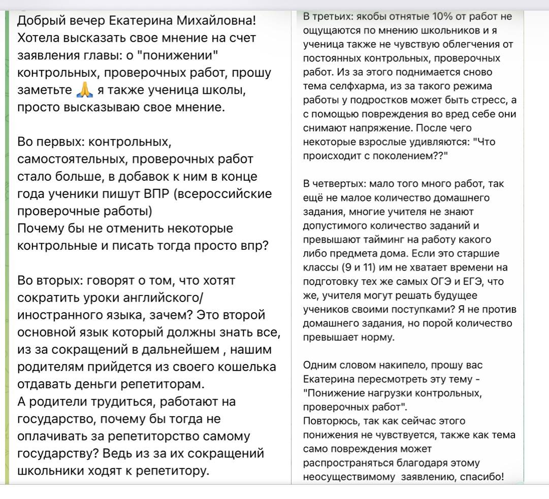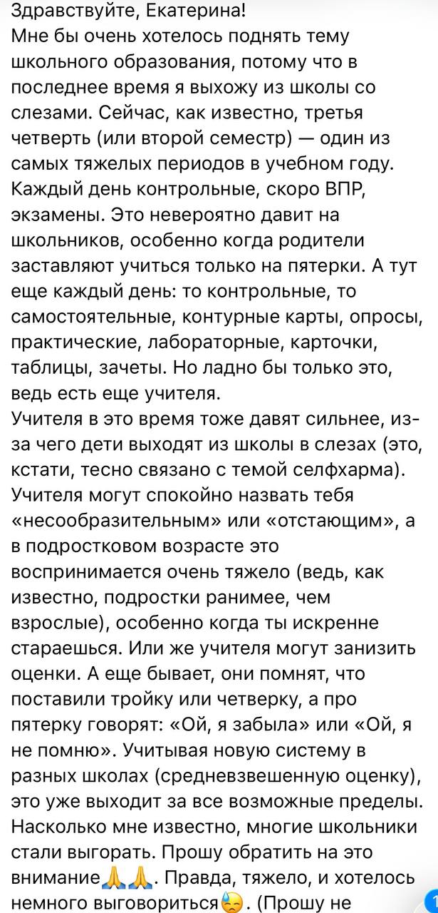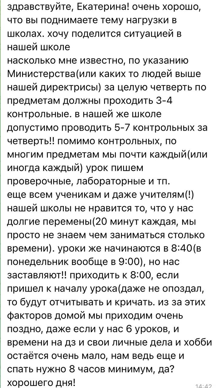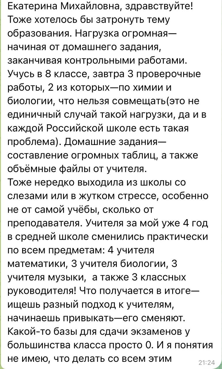 Вот, что пишут школьники. Письма на тему нагрузки в школах, количества контрольных и проверочных работ, домашнего задания я могу публиковать без остановки несколько недель подряд (кстати, в скриншотах - это письма, которые пришли в разные дни в феврале). Каждый день в последние три года своими переживаниями на эту тему со мной делятся десятки ребят. Некоторые подростки пишут мне в слезах, так как уже просто не выдерживают стресс
