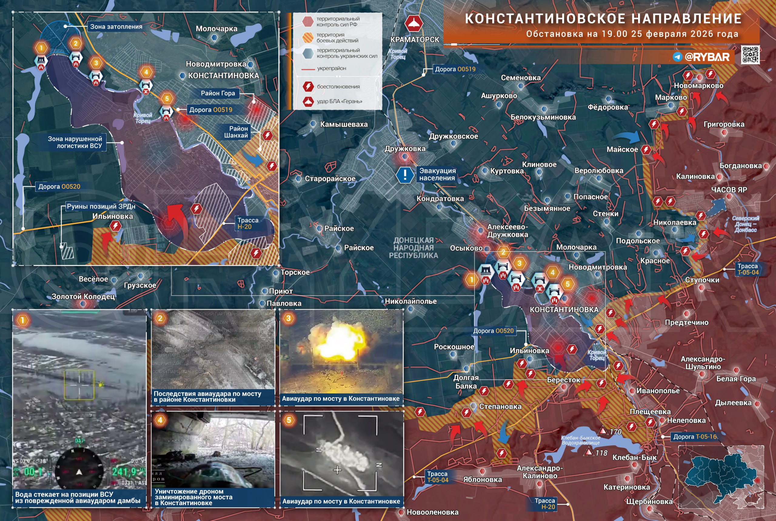 Некоторое время назад авиаудару подверглась дамба между Константиновкой и Алексеево-Дружковкой, что привело к подтоплению прилегающей территории. Это временно осложнит снабжение украинских формирований в юго-западной части Константиновки. Несколько грунтовых дорог и переправа также оказались непроходимыми.