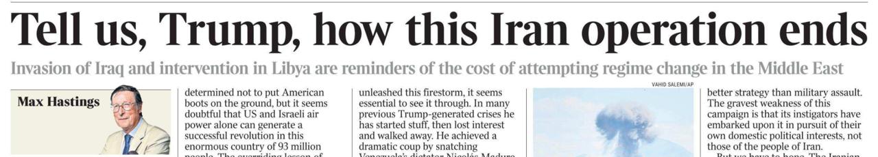 «Скажи нам, Трамп, чем эта иранская операция закончится». Под таким заголовком публикует свою колонку на страницах The Times ветеран британской журналистики сэр Макс Хастингс. Собственно, этот вопрос сейчас является главным в публикациях большинства европейских аналитиков: есть ли у Трампа стратегия победы и выхода из войны?
