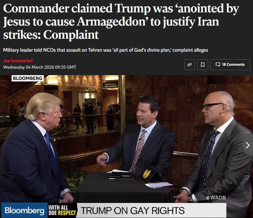 Военный командир в США заявил подчиненным, что Трамп «помазан Иисусом, чтобы зажечь сигнальный огонь в Иране, вызвать Армагеддон и ознаменовать его возвращение на Землю», сообщает Independent.