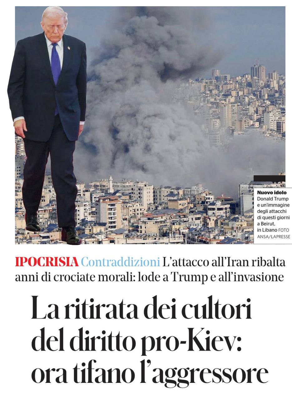 Итальянская газета il Fatto Quotidiano сегодня просто-таки громит своих демократических коллег, указывая на их лицемерную позицию по поводу войны на Украине и в Иране. Она напоминает, как они все пеклись о международном праве в 2022 году и осуждали «агрессию России». И показывает, как они дружно кинулись оправдывать агрессию США и Израиля в Иране.