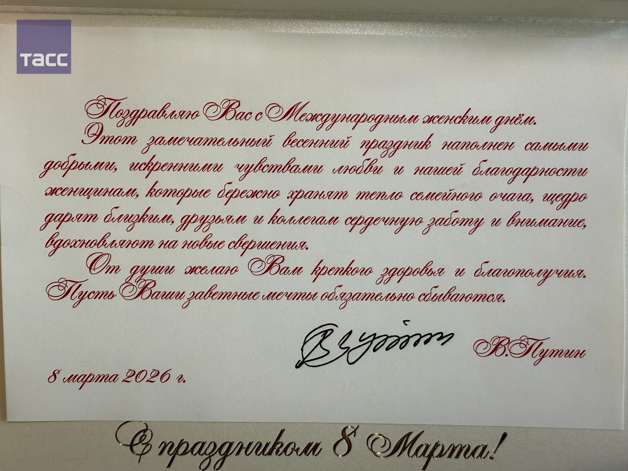 Путин поздравил россиянок с предстоящим 8 Марта. Открытка за подписью главы государства поступила сотрудницам ТАСС.