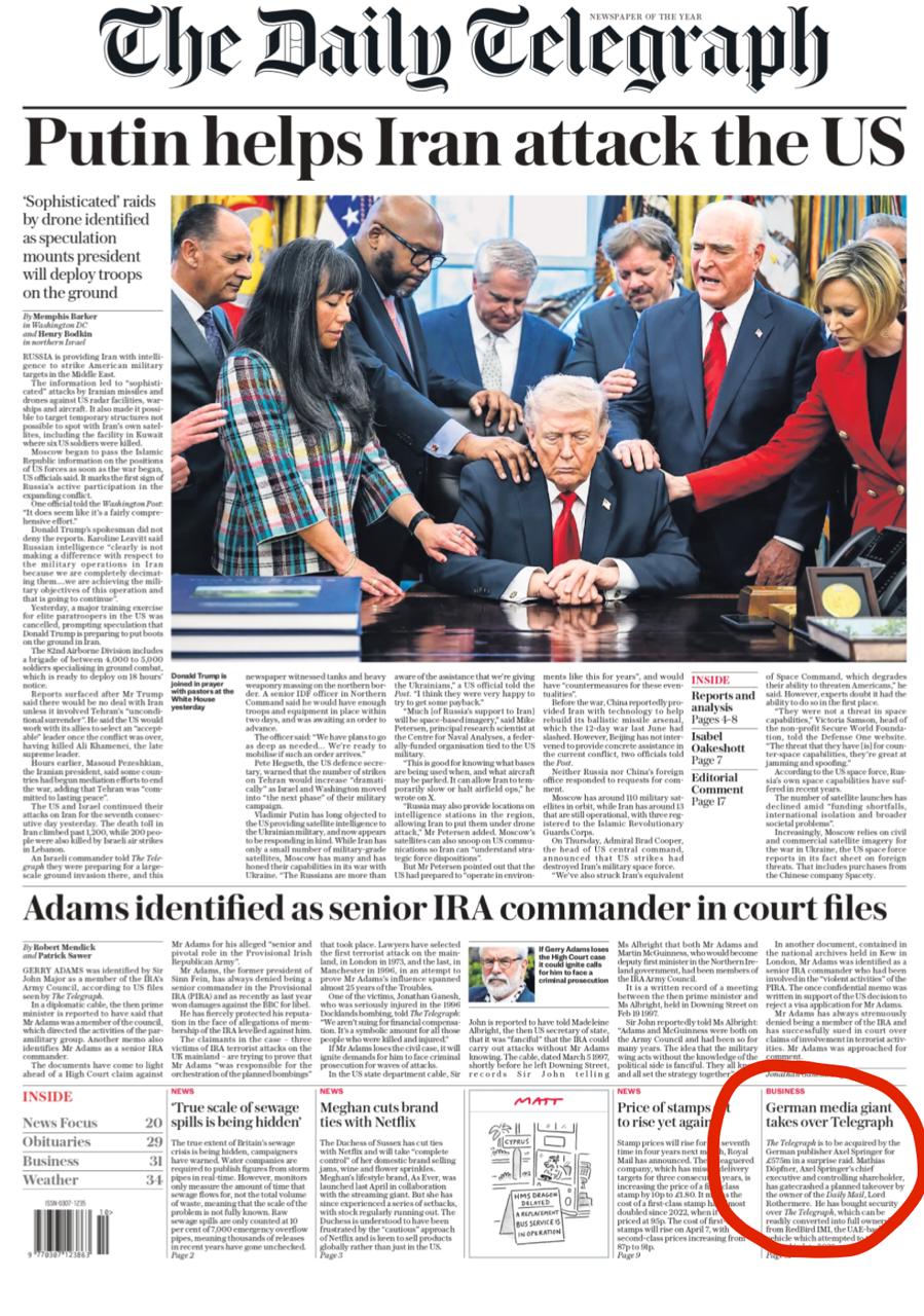 Но я обратил внимание на другое! Британская газета считает, что помощь России Ирану гораздо важнее информации о том, что эта газета… продана немцам! Вон видите, я специально обвел малюсенькую заметочку о продаже Telegraph германскому издателю Alex Springer, с выносом на небольшую статью аж на 31 странице!