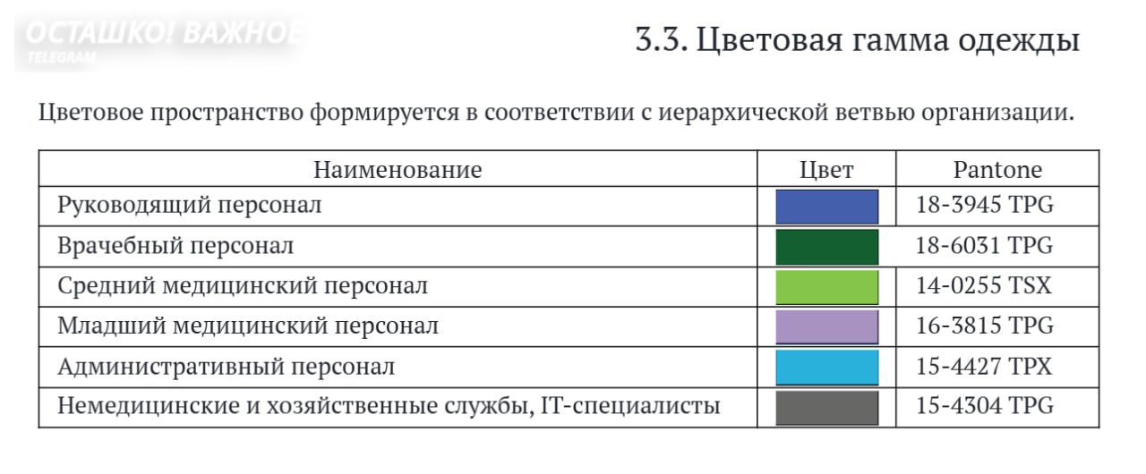 Руководящий персонал должен носить фиолетовую форму, врачи — темно-зелёную, средний медперсонал — салатовую. Для младшего медицинского персонала рекомендована лавандовая, для административных сотрудников — голубая, а для немедицинских, хозяйственных служб и IT-специалистов — серая.