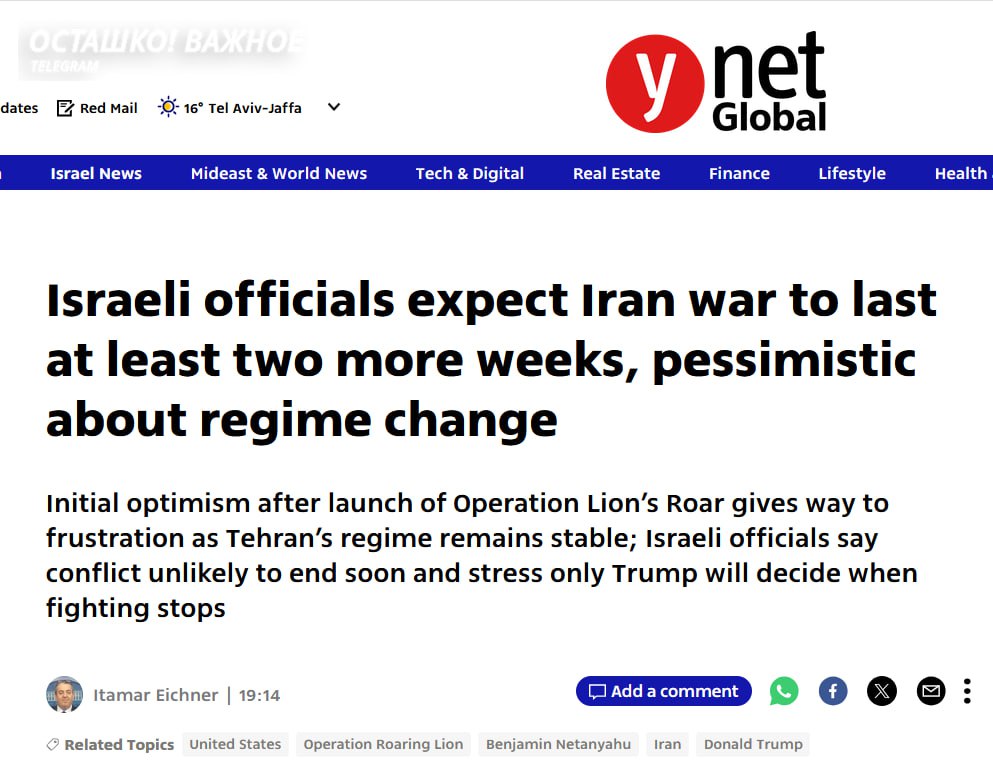 Конфликт с Ираном после операции «Рёв льва» продлится как минимум ещё две недели и вряд ли закончится свержением аятолл, — пишет израильское издание Ynet со ссылкой на источники.