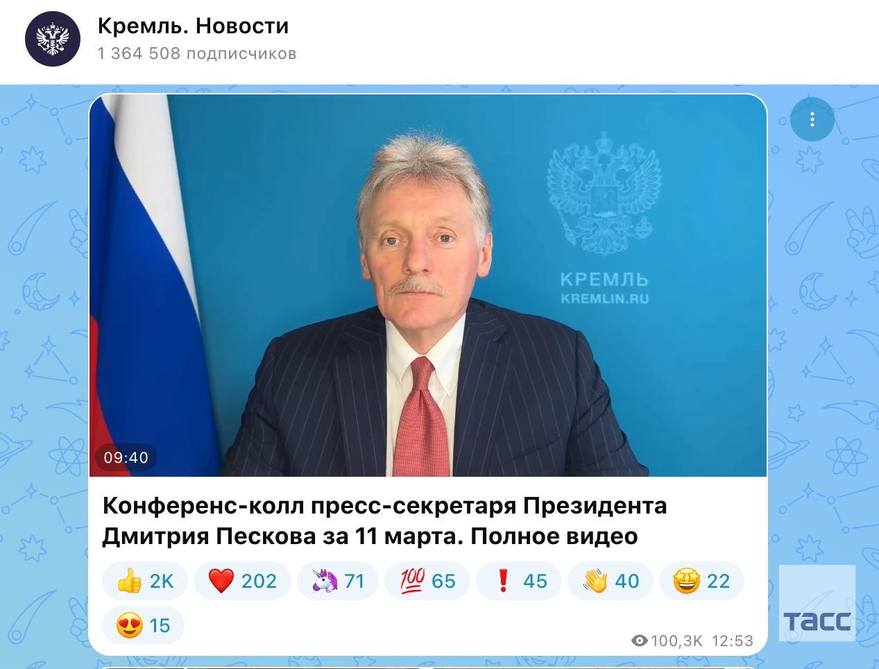 Кремль впервые опубликовал видео брифинга Пескова в Max.