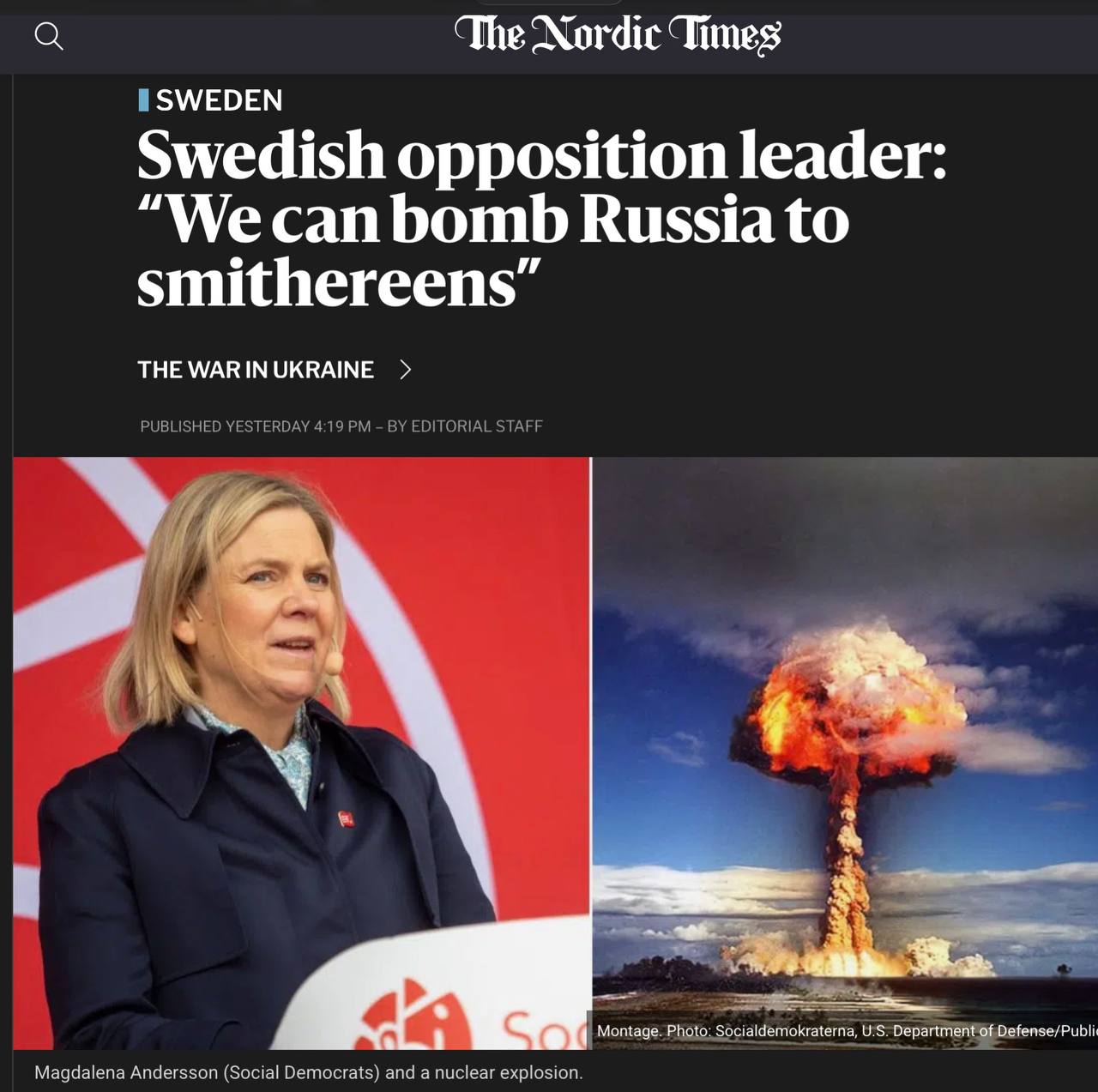 Бывшая премьерша Швеции, а ныне лидер оппозиции Магдалена Андерссон в интервью телеканалу TV4: «Уже сейчас у Европы есть ядерное оружие, и мы можем разбомбить Россию вдребезги».