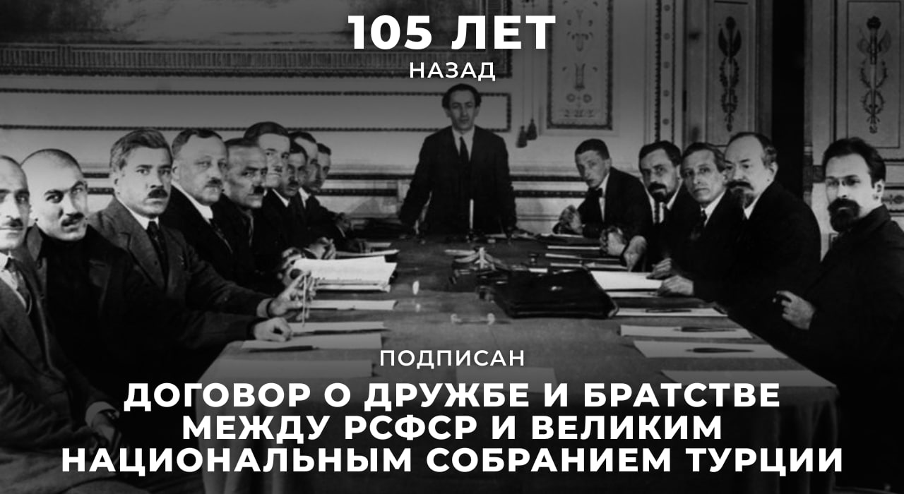 16 марта исполняется 105 лет со дня подписания Договора о дружбе и братстве между Российской Социалистической Федеративной Советской Республикой и Великим национальным собранием Турции, вошедшего в историю как Московский договор 1921 года.
