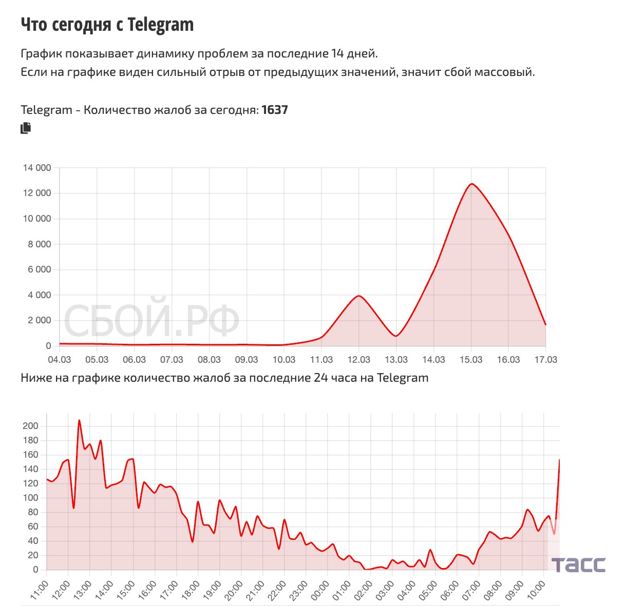 Российские пользователи Telegram продолжают жаловаться на сбои в работе мессенджера, свидетельствуют данные сервиса "Сбой. РФ".