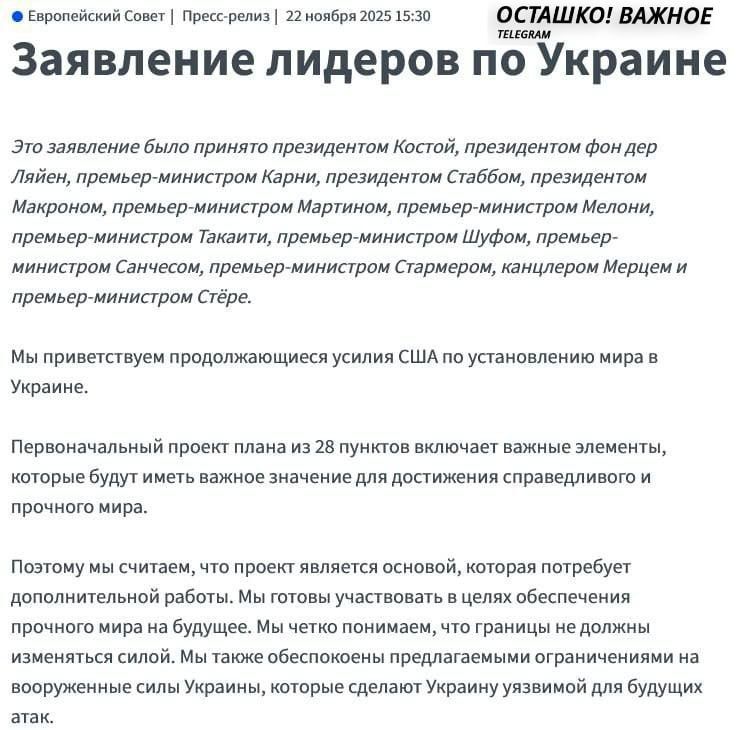 Европейские лидеры намерены обсудить изменения в американском мирном плане по Украине на встрече с представителями США, которая пройдёт в Женеве. По словам дипломатов, речь идёт о попытке смягчить пункты, вызывающие...