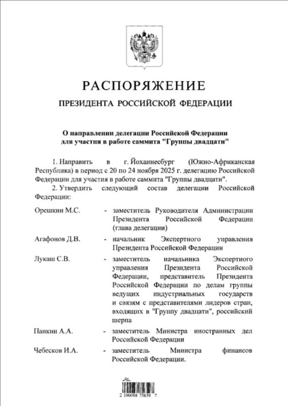 Орешкин возглавит делегацию России на саммите G20 в ЮАР, следует из распоряжения Путина.