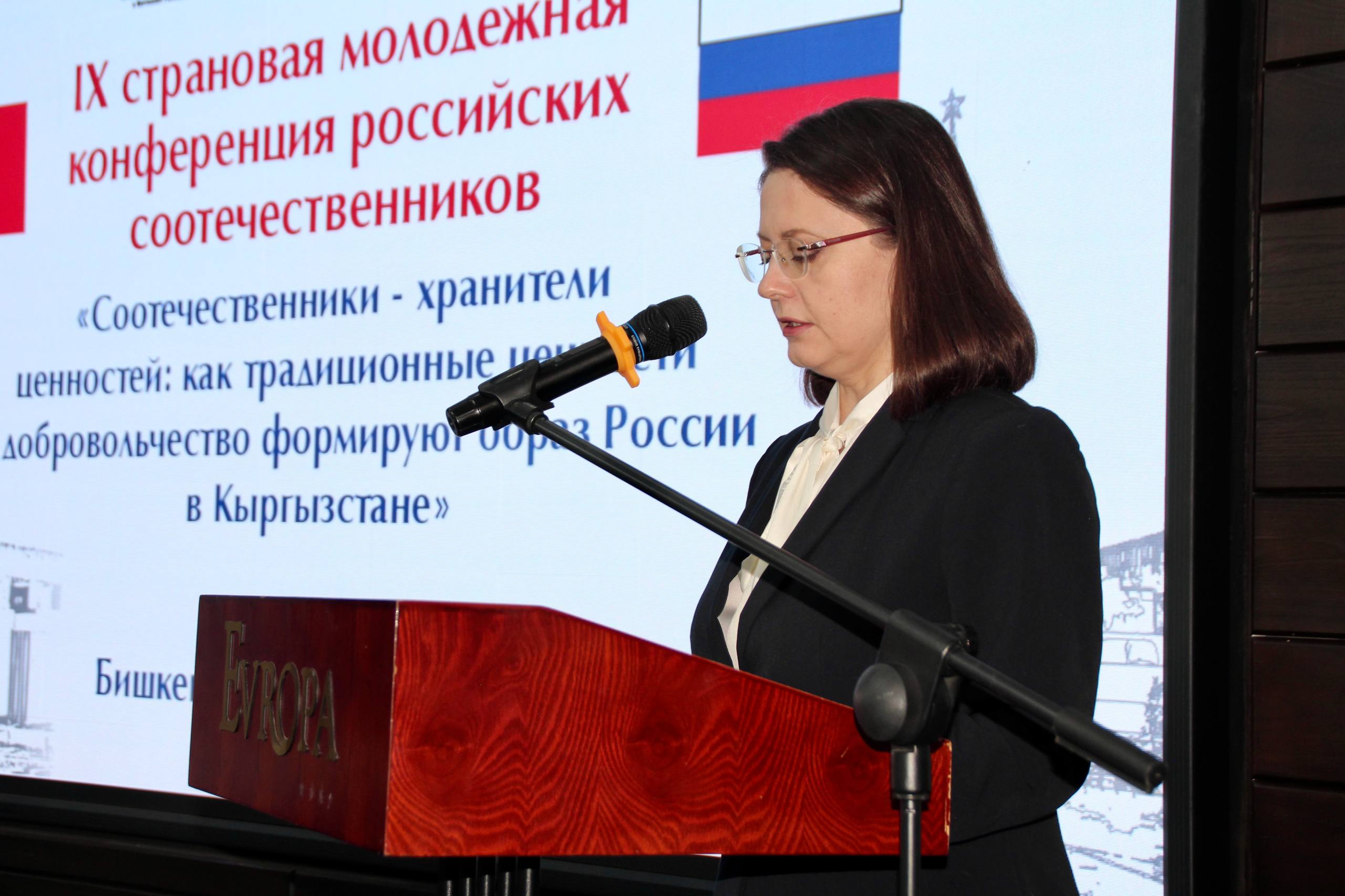 и заместителя руководителя Россотрудничества И.Ю.Чайки. К участникам конференции обратились советник-посланник Посольства России в Кыргызстане Е.С.Чистова, руководитель Представительства Россотрудничества А.Ф.Зульхарнеев, проректор по образовательной деятельности Кыргызско-Российского Славянского университета М.Г.Юрченко, председатель Координационного совета российских соотечественников в Кыргызстане З.Х.Шидакова.