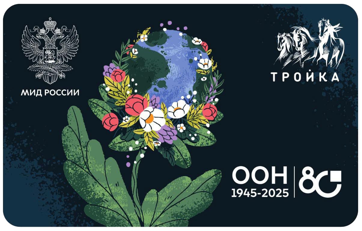 В ознаменование 80-летия основания Организации Объединенных Наций МИД России совместно с Информационным центром ООН в Москве, Департаментом транспорта и развития дорожно-транспортной инфраструктуры города Москвы, а также ГУП «Московский метрополитен» реализовали инициативу по выпуску карты «Тройка» с тематическим оформлением.