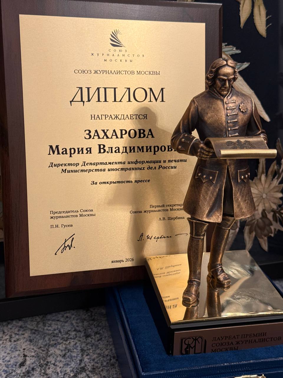 Получила награду Союза журналистов Москвы «За открытость прессе». Благодарю!